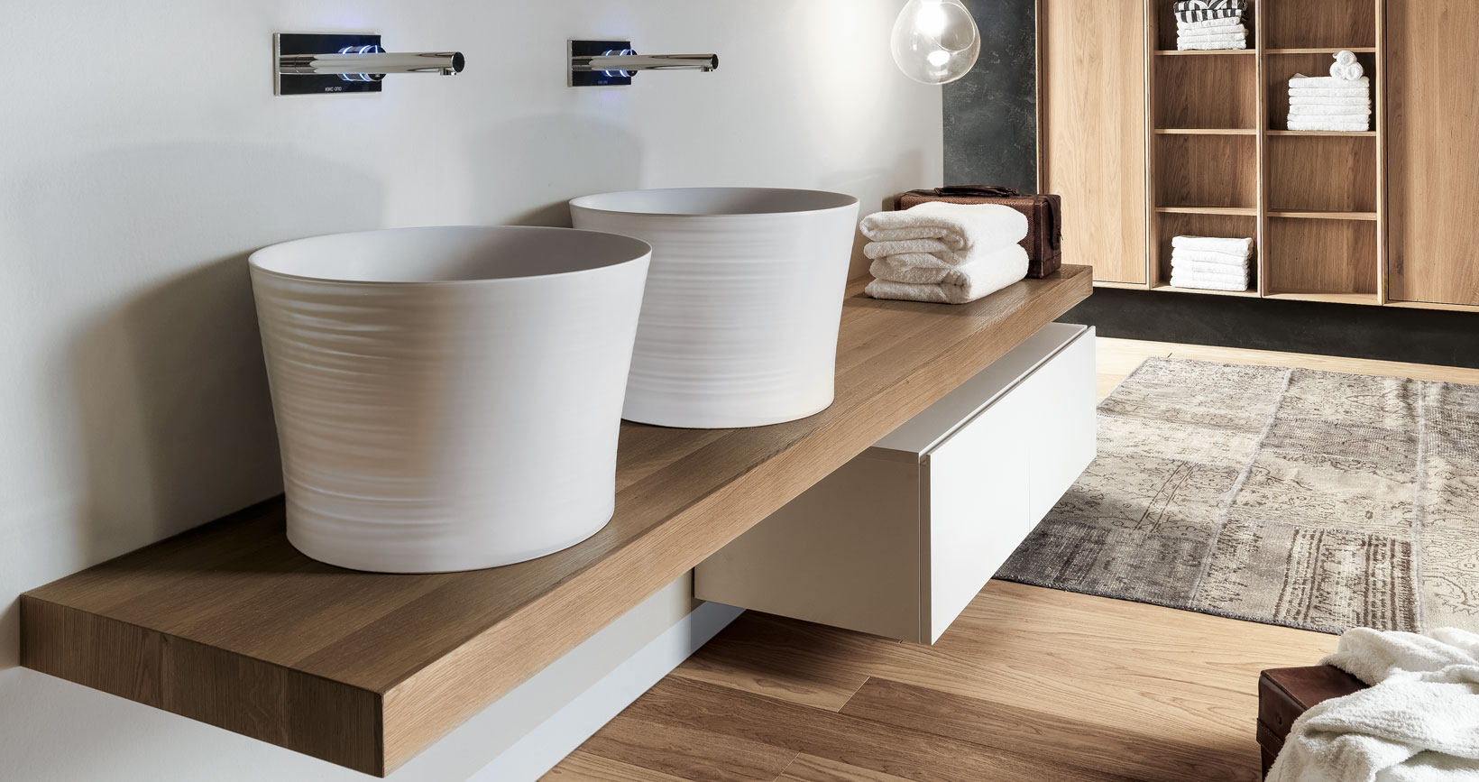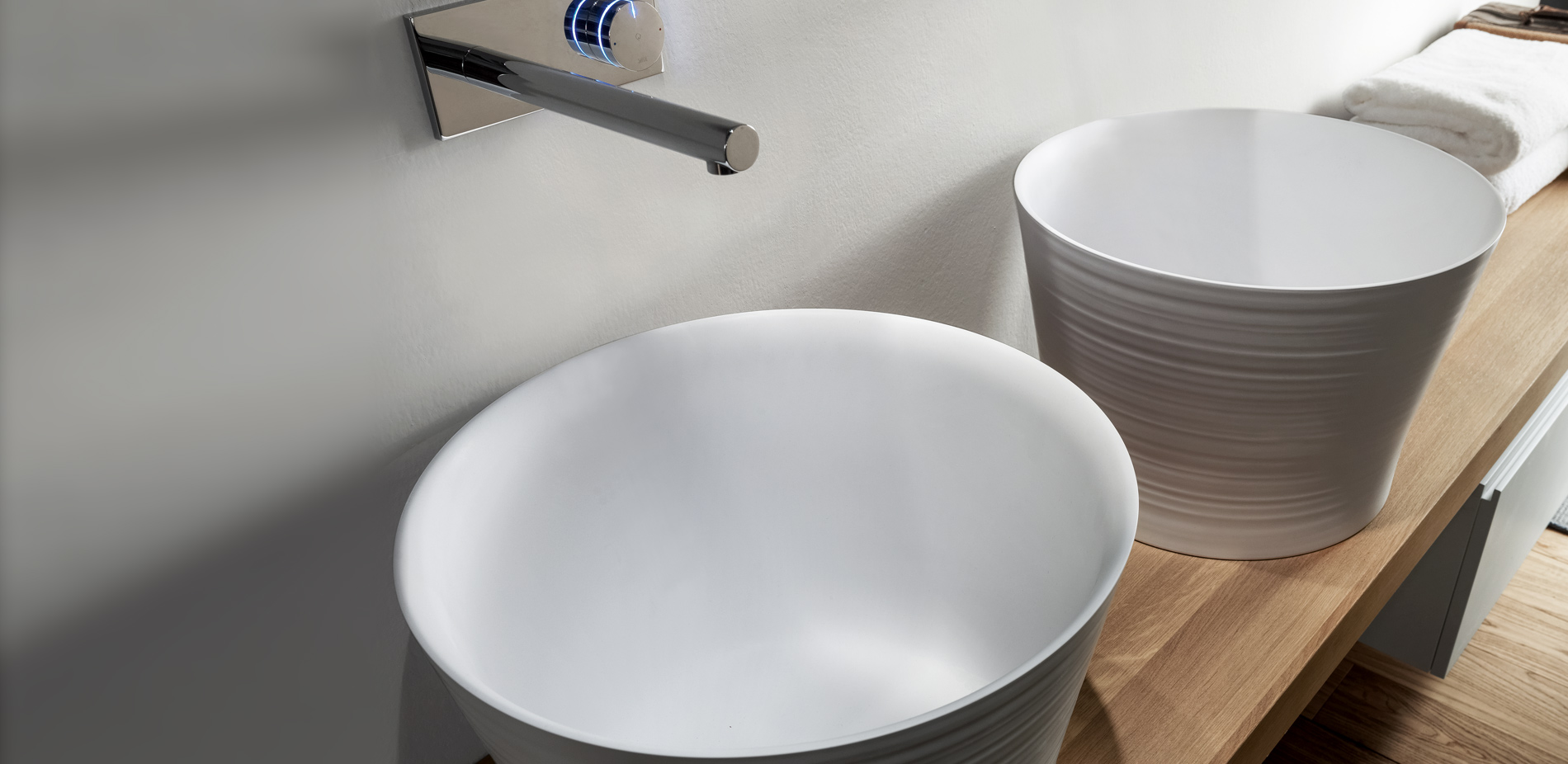 亚光白色 Cristalplant Biobased 台面式洗脸盆。采用世界上性能最好且经过认证的材料制成,用于制造洗脸盆和浴缸,能够提供独特的柔软和均匀的触感和光反射效果。
