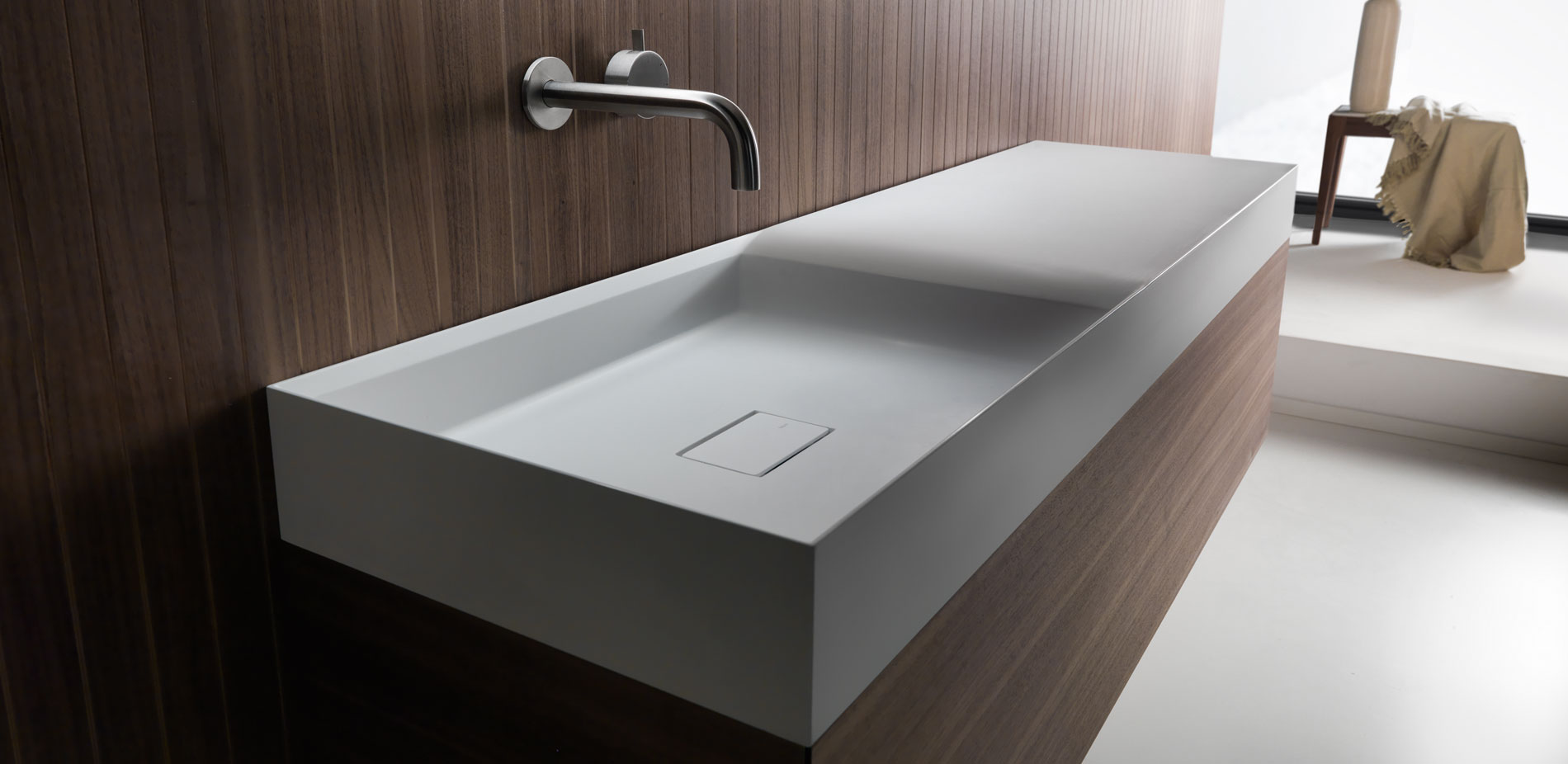 Cristalplant Biobased 壁挂式和台面式洗脸盆。采用世界上性能最好且经过认证的材料制成,用于制造洗脸盆和浴缸,能够提供独特的柔软和均匀的触感和光反射效果。