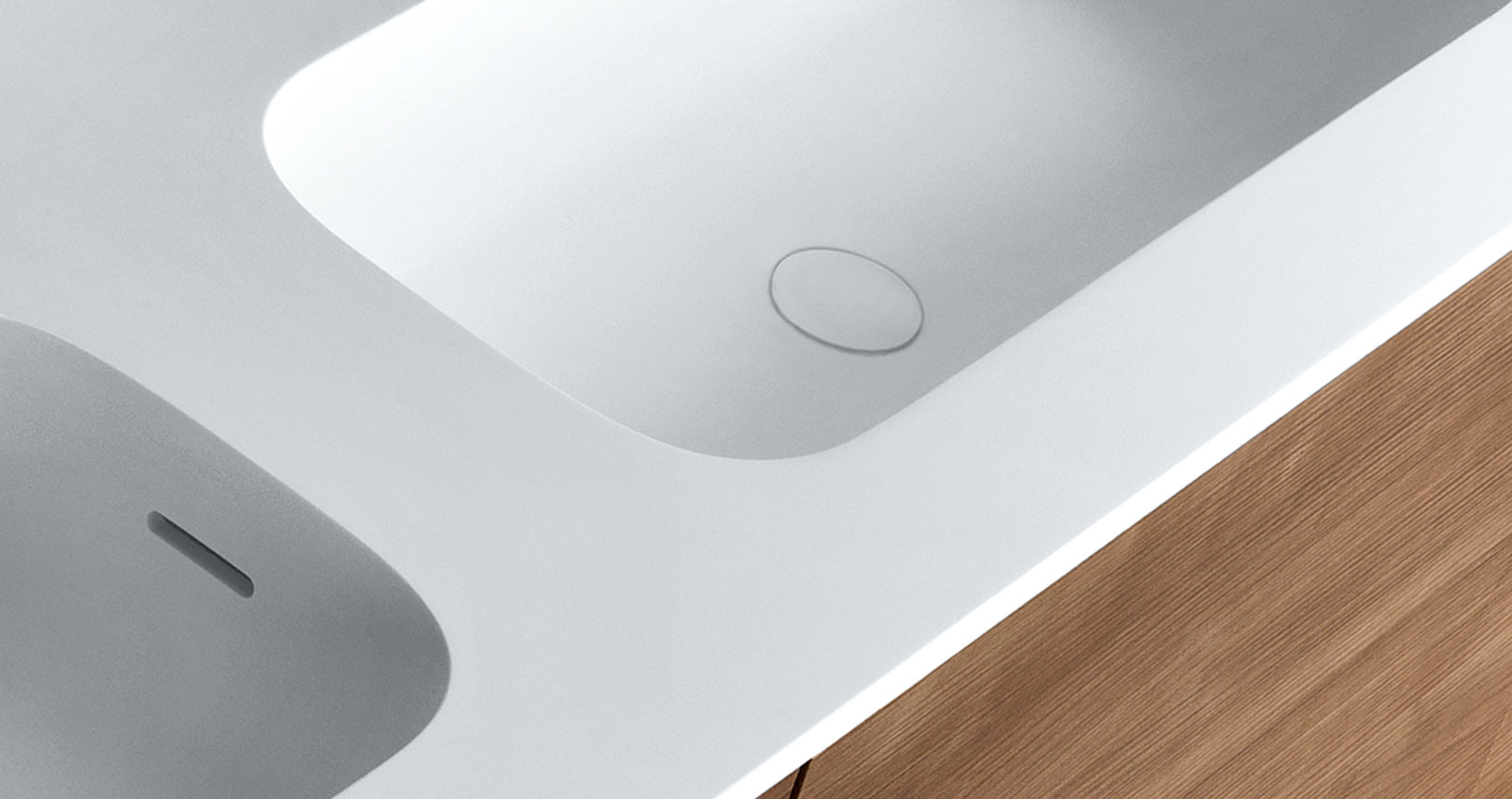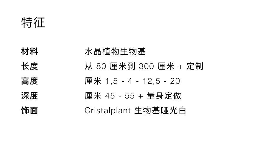 带有 Cristalplant Biobased 的独特和独特设计的带洗脸盆的集成台面系列,在尺寸和厚度以及洗脸盆在台面的定位方面具有无限的定制可能性。Cristalplant Biobased 是世界上性能最好、经过认证的用于制造洗脸盆和浴缸的材料,具有独特的柔软和均匀的触感和光反射效果。