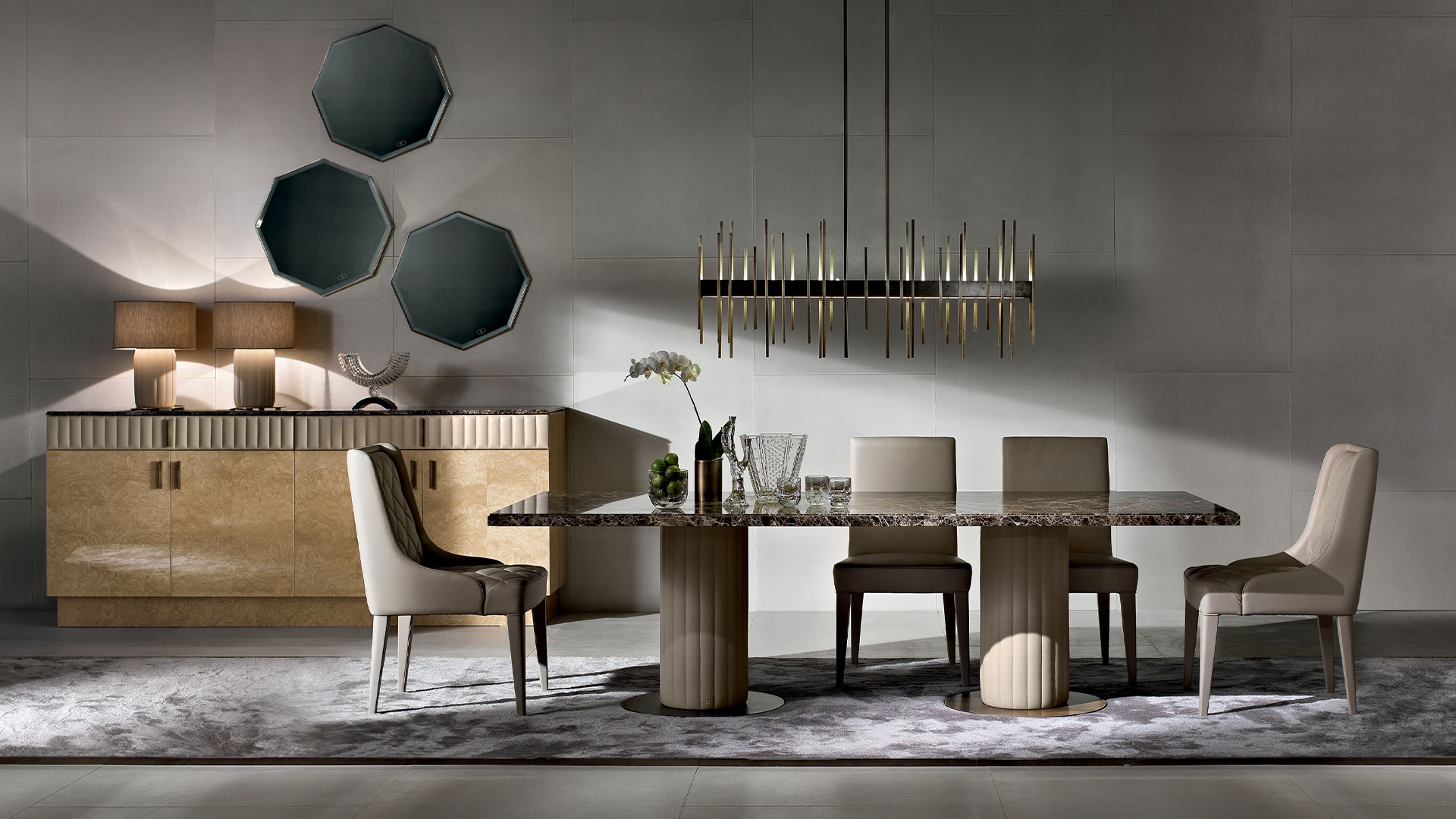 胶合板结构,桃金娘树节衬里,拉丝光泽饰面。抽屉采用 cannetté 绗缝,采用织物软垫和柔软的金属导轨。大理石台面。