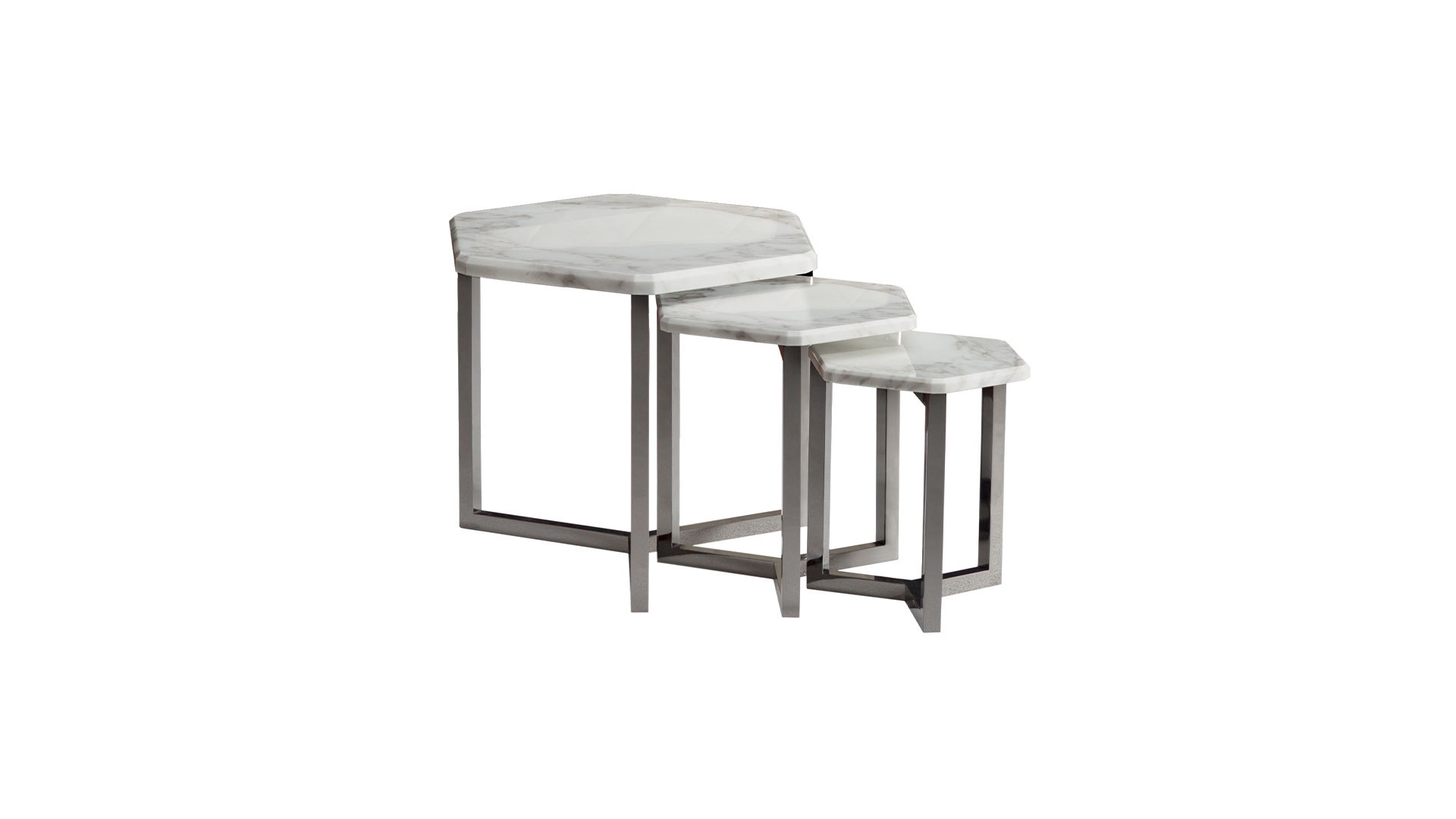 三款咖啡桌采用钛合金饰面黄铜结构和六角形大理石台面。