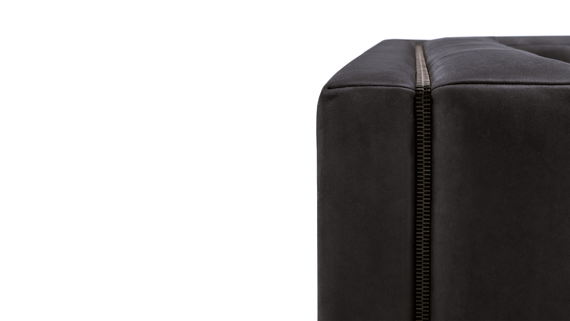 多层和钢结构,涂有各种密度的橡胶,记忆上层覆盖整个表面的柔软鹅绒层。亚光黑色饰面钢装饰拉链和脚。座椅带有 6 厘米弹性带。