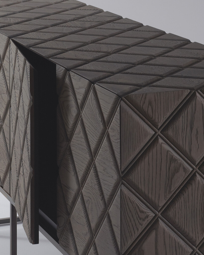 通过玩弄严谨的形状和柔和的装饰之间的对比进行设计。Tiberio Matelassé诞生了,其特点是框架和存储体积,如果没有这种珍贵而舒适的质感使它们更加受欢迎,那将是纯粹的理性。这种组合使物体舒适而独特。