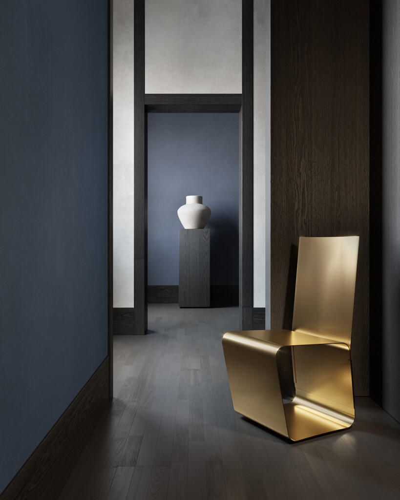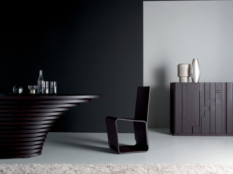 优雅的椅子,采用弯曲的胶合板制成,由整张精华制成。实现的极端困难使它成为一件艺术品。它也可以根据要求提供完全采用折叠和模制黄铜板的版本。