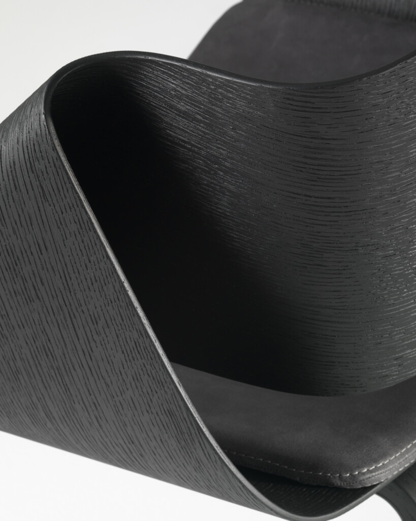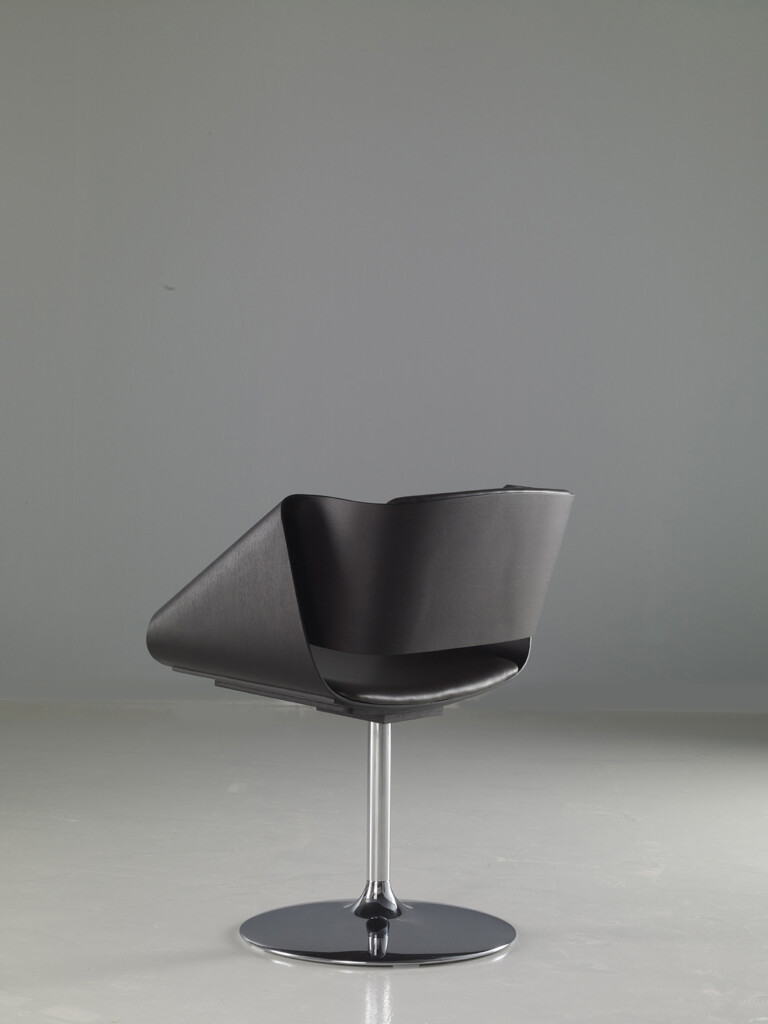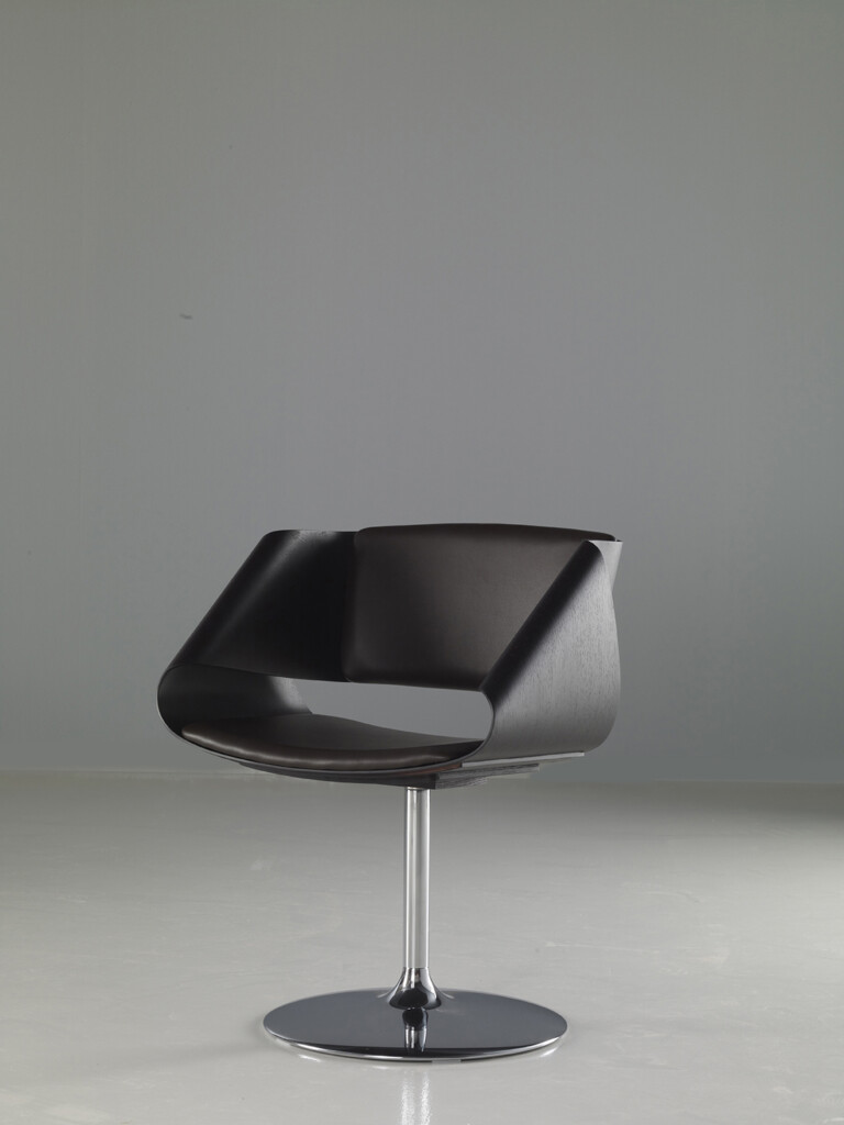 弧形胶合板扶手椅。旋转结构采用镀铬或固定金属制成,带4条支腿。座椅带有固定的皮革垫,由一块长胶合板形成,在形成扶手的形状后,在座椅下方连接。实现的极端困难使它成为一件艺术品。