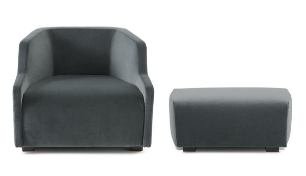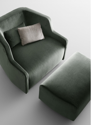 扶手椅和坐垫凳采用不同密度的不可变形聚氨酯泡沫和聚酯纤维制成,内部木质结构。黑漆木脚。可提供样品颜色的织物或皮革内饰。聚酯纤维装饰靠垫,可应要求提供。