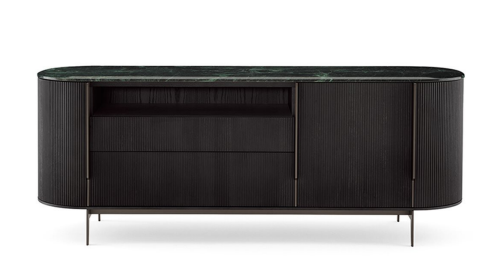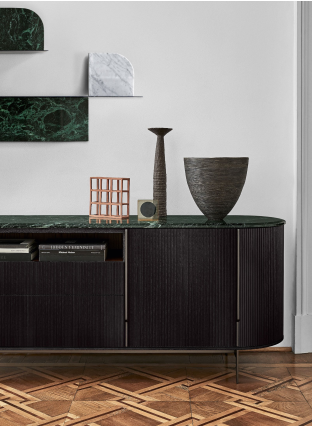 带门、抽屉和开放式隔间的日间柜子。黑色染色开孔菩提树或染色开孔胡桃木结构,正面和侧面覆盖有手工滚花带。带门的隔间配有木架子。对于黑色染色版本,顶部采用斜面 Calacatta Vagli Oro 或 Verde Alpi 大理石或 6 毫米钢化玻璃,背面涂有亮黑色饰面。泥色漆金属手柄和金属部件。胡桃木染色版本顶部采用斜面 Calacatta Vagli Oro 或 Verde Alpi 大理石或 6 毫米钢化玻璃,背面涂有甘草色、蓝灰色或绿灰色。