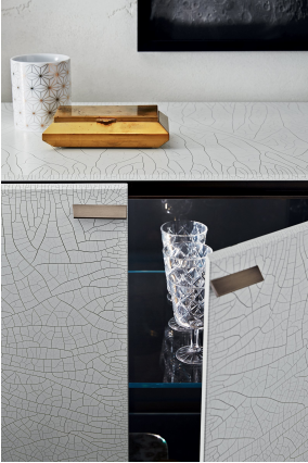 餐具柜采用 8 毫米超轻钢化玻璃,手工和独家加工装饰。明亮的青铜背漆内饰。配备 8 毫米超轻钢化玻璃搁板。结构和手柄,金属和底座,木质,涂有古铜色。编号版收藏。