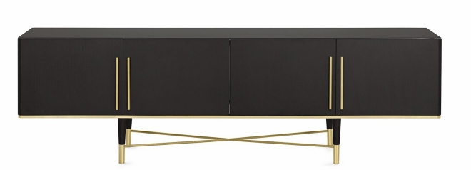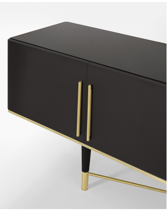 开孔黑色染灰餐具柜,带有缎面黄铜漆面金属部件。顶部和内部背部采用 6 毫米钢化玻璃,背面涂有明亮的甘草。在内部水晶钻石雕刻。内部搁板采用 8 毫米“grigio Italia”钢化玻璃和木制托盘。配备内部 LED 灯(15 瓦)。(LED 15 瓦 - 108 流明/瓦,3000K)。