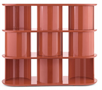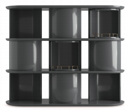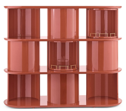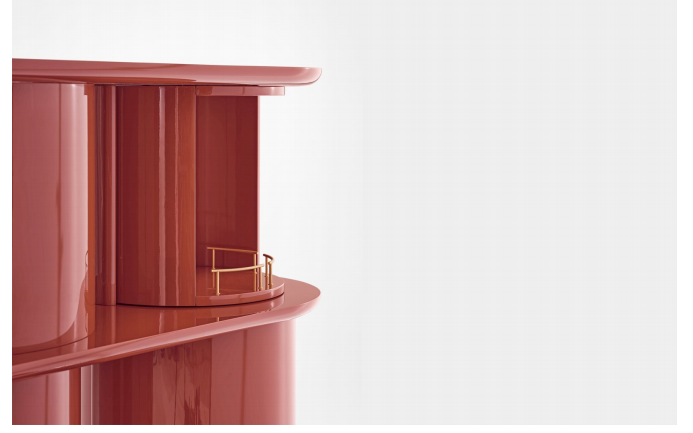 带有结构、搁板和半圆柱体的容器,采用“Rosso Persia”或“Grigio Londra”颜色的光泽或哑光漆木制成。带双面开口的半圆柱体。带有旋转气缸的可用版本,在预先确定的位置,允许关闭隔间。缎面黄铜细节。