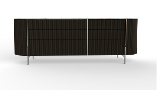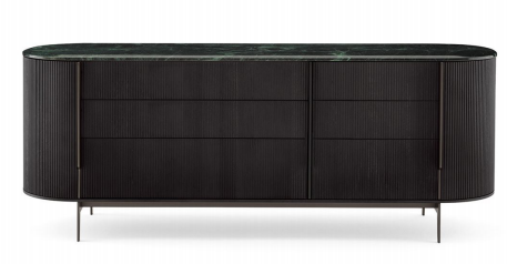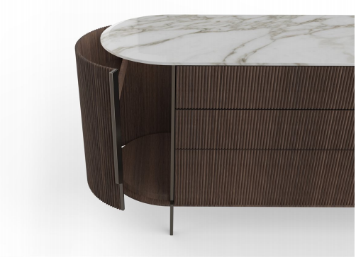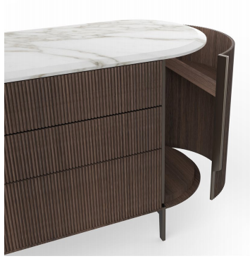 带门和抽屉的夜间家具。黑色染色开孔菩提树或染色开孔胡桃木结构,正面和侧面覆盖有手工滚花带。侧门配有木架子。对于黑色染色版本,顶部采用斜面 Calacatta Vagli Oro / Verde Alpi 大理石或 6 毫米钢化玻璃,背面涂有亮黑色饰面。泥色漆金属手柄和金属部件。胡桃木染色版本,顶部采用斜角 Calacatta Vagli Oro / Verde Alpi 大理石或 6 毫米钢化玻璃,背面涂有甘草色、蓝灰色或绿灰色。