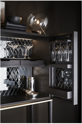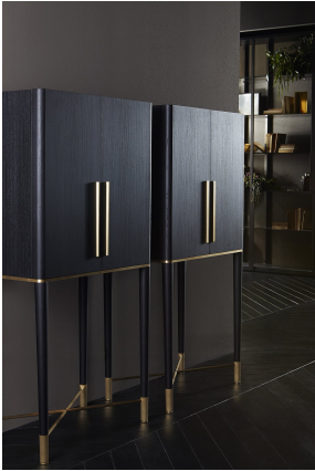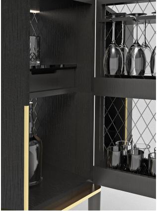 开孔黑色染色白蜡木酒吧柜,带有缎面黄铜漆面金属部件。内部覆盖有雕刻的 4 毫米“grigio Italia”镜子。“Grigio Italia”8 毫米钢化玻璃内部搁板。配备内部 LED 灯(15 瓦)。(LED 15W - 108lm/w,3000K)。