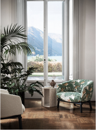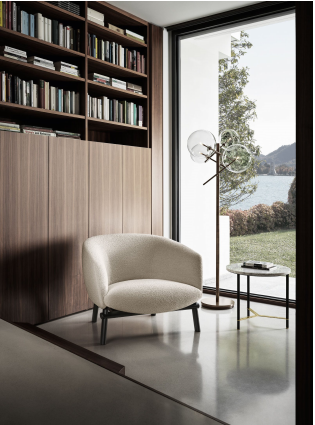 扶手椅的内部结构为木材及其衍生物和金属部件。填充不同密度的不可变形聚氨酯泡沫和聚酯纤维。底座为开孔黑色染色固体灰。可提供样品颜色的织物或皮革内饰。完全可拆卸。