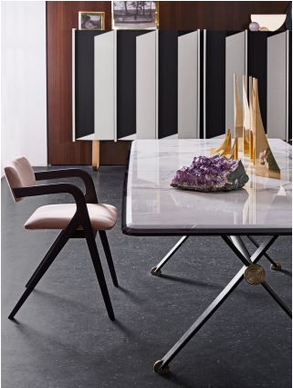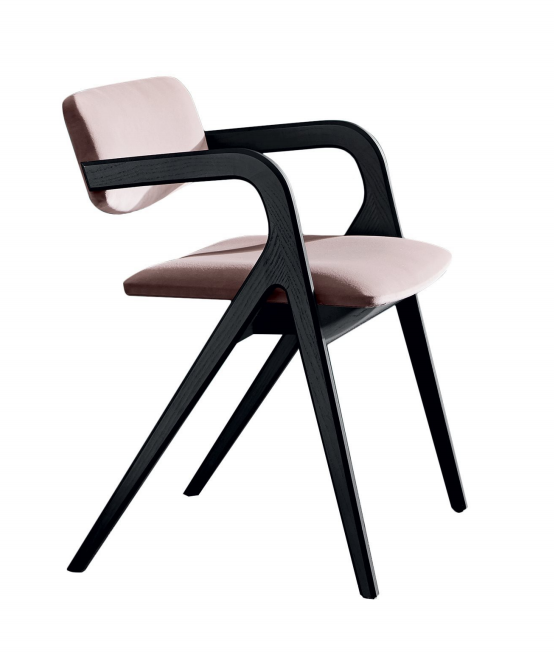 椅子采用弯曲实心白蜡木结构,开孔黑色染色。也可提供天然灰、烟草染色或开孔白色染色。座椅内部结构为木材和副产品,填充有不可变形的聚氨酯泡沫。结构聚氨酯靠背嵌入软质聚氨酯泡沫中。样品颜色的织物或皮革内饰。不可拆卸。