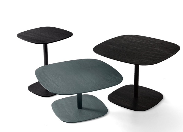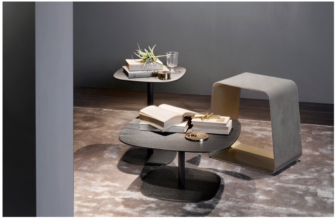 咖啡桌采用黑色、钛金属或金色手工拉丝铝制顶部和结构。