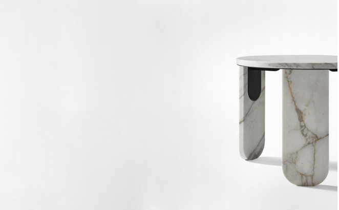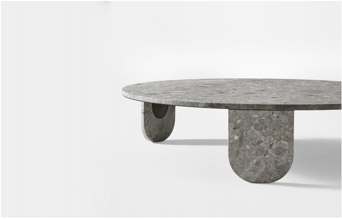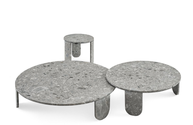 拉丝 Ceppo di Grè 咖啡桌,带有手工抛光金属细节。还提供天然抛光 Calacatta Vagli Oro、Bianco Carrara 大理石或拉丝 Fior di Pesco 大理石。
