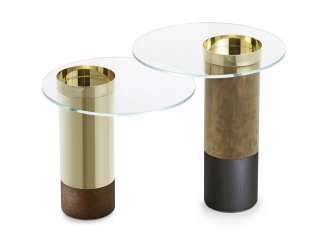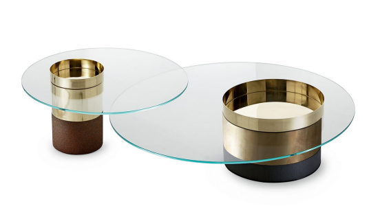 带 10 毫米超轻钢化玻璃桌面的咖啡桌。底座采用黑色开孔或锈漆木。抛光黄铜、手工抛光、铜或黑铬金属零件。