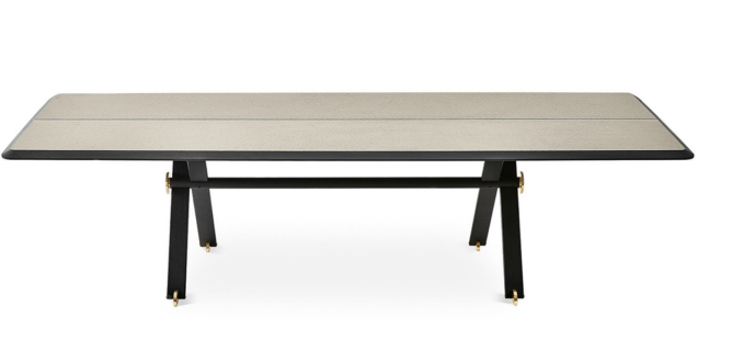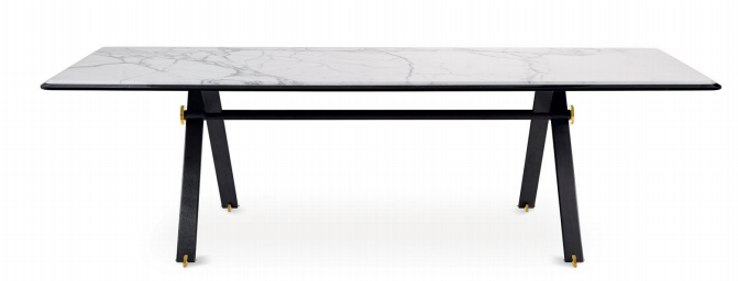 桌子采用手工拉丝和黑色阳极氧化铝结构。抛光黄铜细节。顶部采用分层斜切 Bianco Statuario 和 Nero Marquinia 大理石。还提供带有“花呢”图案的镶嵌木材。根据要求,15 毫米斜面玻璃顶部涂有亮色或缎面样品的颜色。