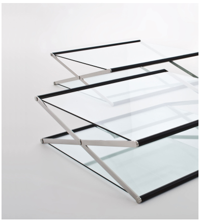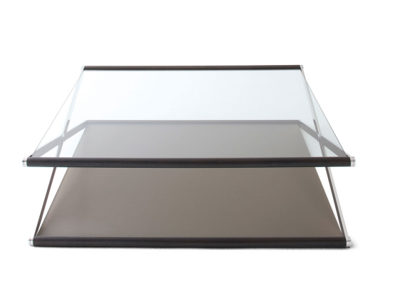 8 毫米钢化玻璃咖啡桌。透明玻璃的上部顶部。背面涂漆玻璃的下部顶部采用亮色或缎面版本样品的颜色。不锈钢或抛光金属结构,部件采用漂白橡木、鸡翅木染色或烟草染色。