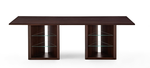 弗里塞色胡桃木办公桌,镶嵌天然铝或印度玫瑰木,镶嵌天然铝。底座配备两个 8 毫米超轻钢化玻璃搁板。