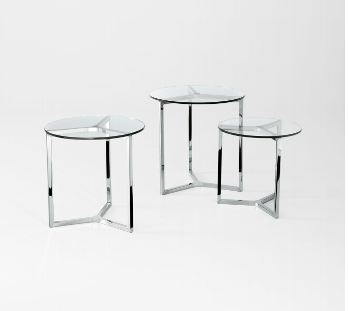 带 10 毫米透明玻璃桌面的咖啡桌。抛光不锈钢结构(轮廓 20x20x1.5mm)。镀铬铝制中央接头。提供“grigio Italia”玻璃台面和抛光金属结构。