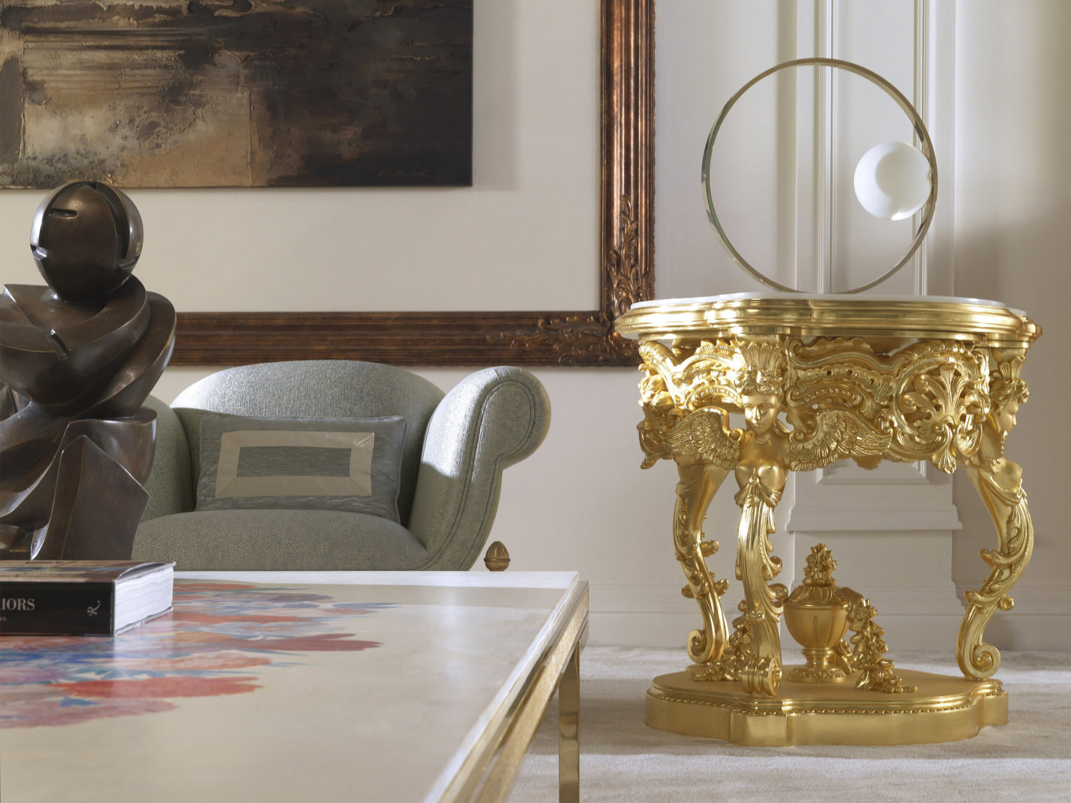 边桌采用手工雕刻的山毛榉木结构,具有光泽和哑光金色饰面。顶部是白色纳米比亚犀牛大理石。