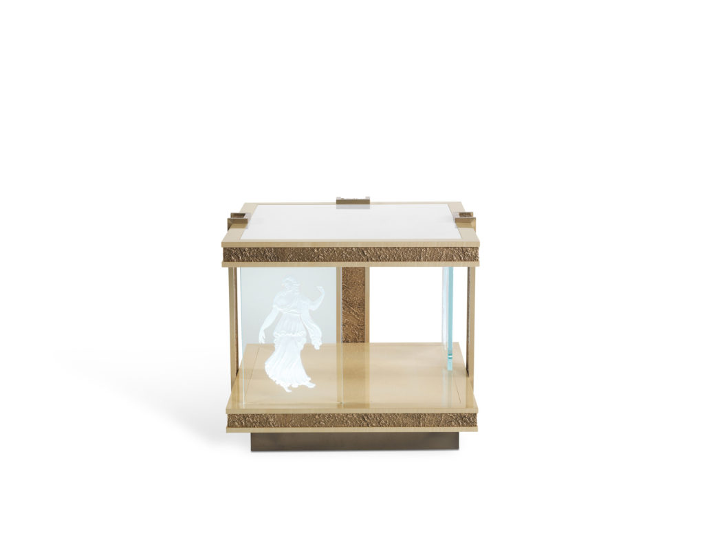 天然枫木结构的边桌。顶部是浅白色大理石。嵌件采用铸造黄铜制成。带有雕刻装饰元素的照明眼镜。