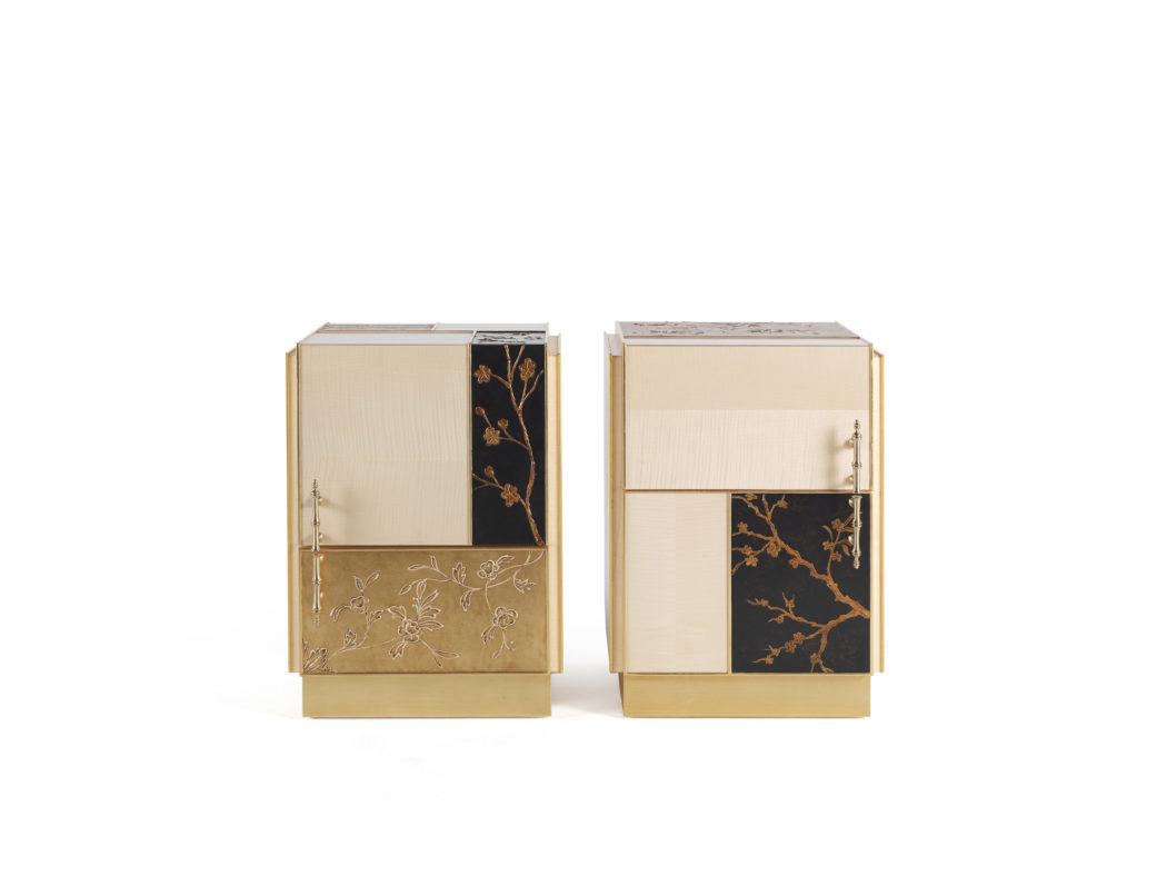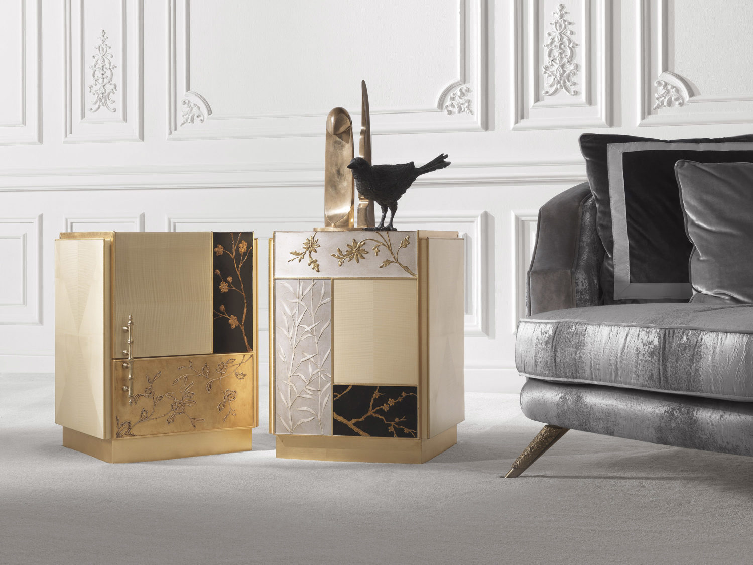 枫木结构边桌,面板装饰有浮雕石膏。底座采用亮金色饰面。