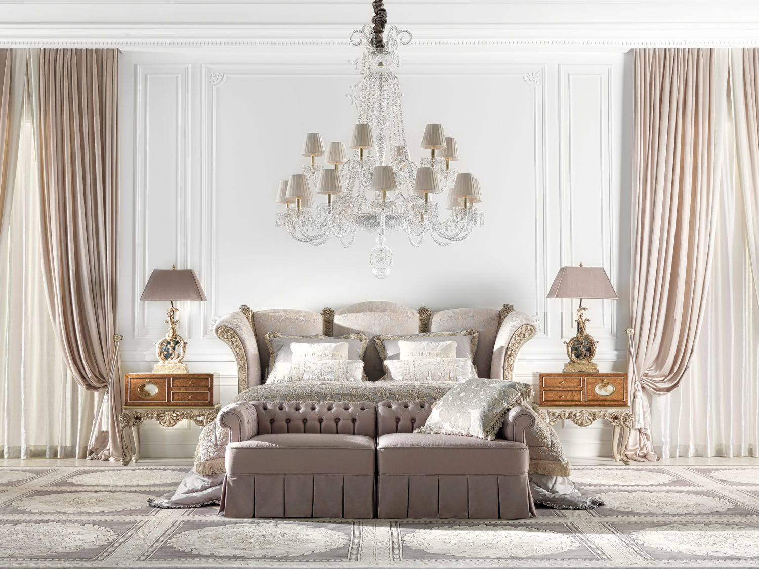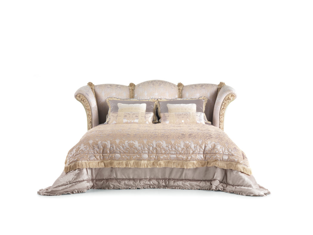 床头板采用手工雕刻的山毛榉木制成,并带有古色古香的白色饰面。织物内饰。
