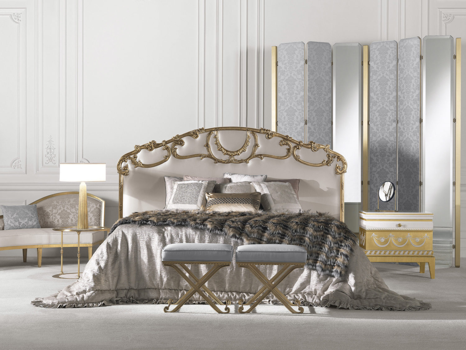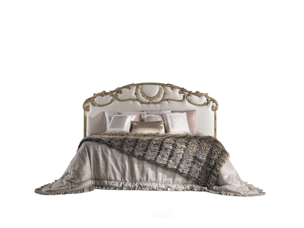 床结构采用手工凿制和失蜡铸造黄铜。床头板采用丝缎面料装饰。