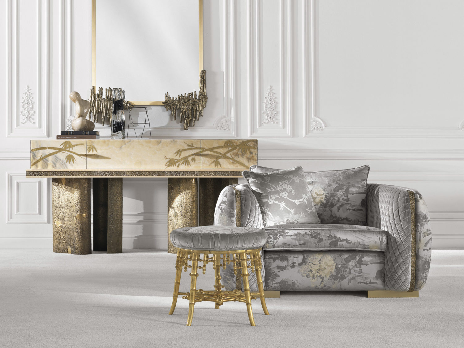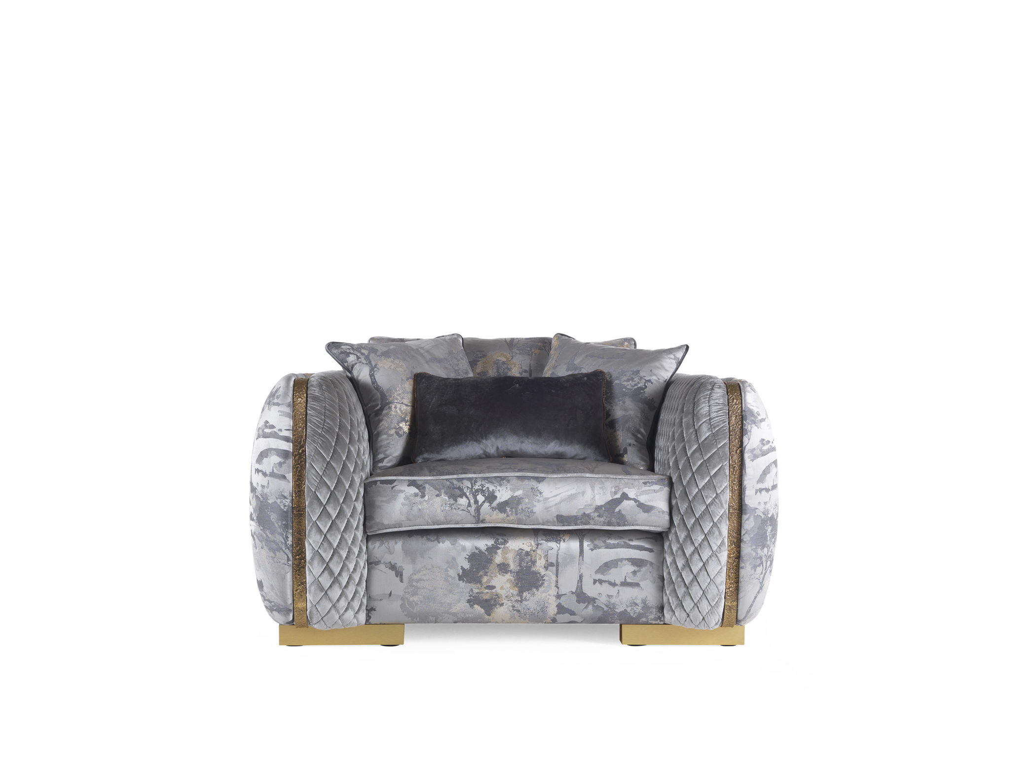 扶手椅,结构采用实心杨木。泡沫填充。织物内饰。内部扶手和外部靠背采用天鹅绒装饰,带绗缝。失蜡铸造黄铜细节。脚与光泽的金色表面处理。
