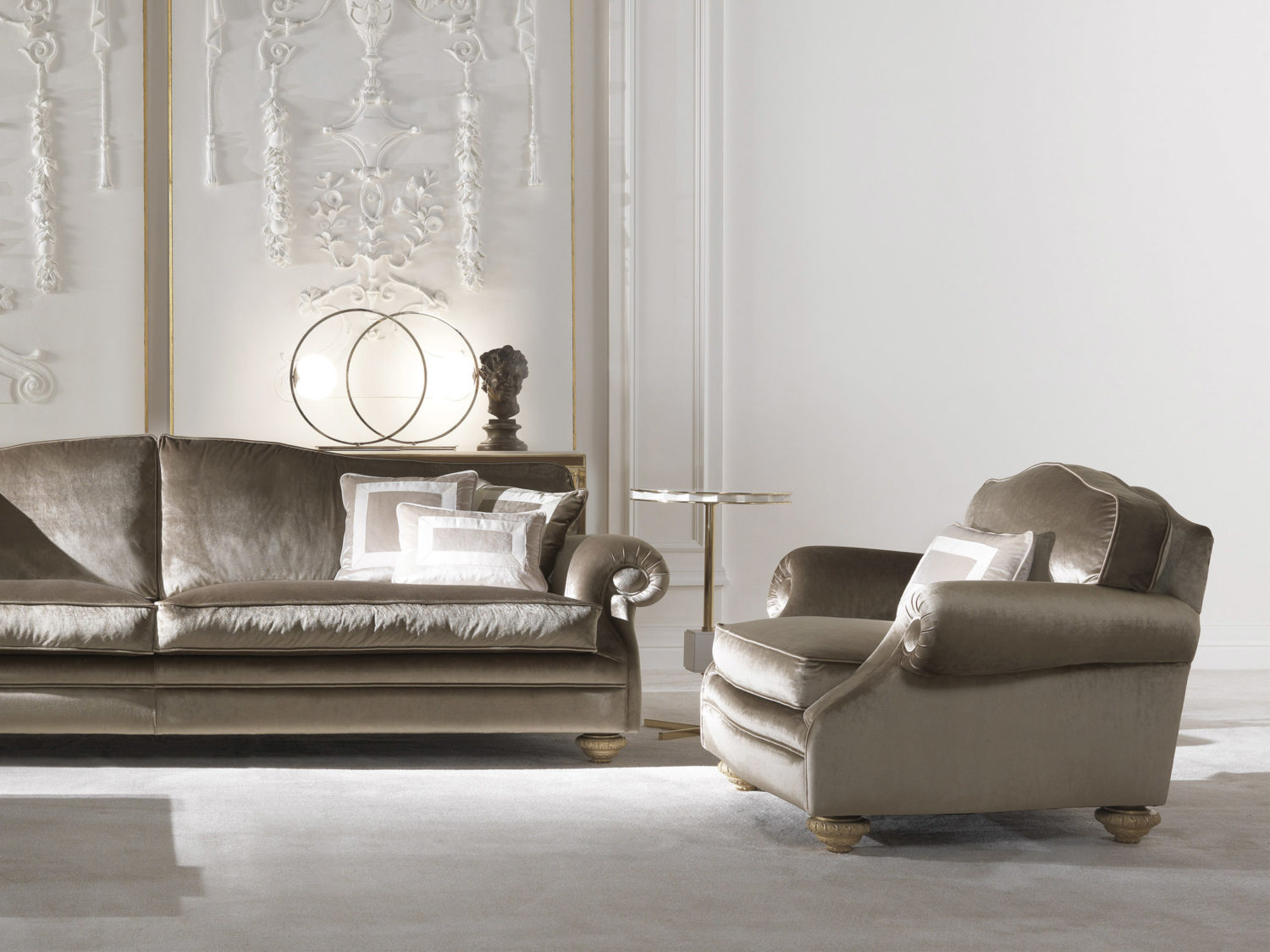 扶手椅,采用山毛榉木结构。泡沫填充。织物内饰。手工雕刻的木腿,带有古色古色古香的金色饰面。N° 1 枕头 50X30 厘米包括在内。