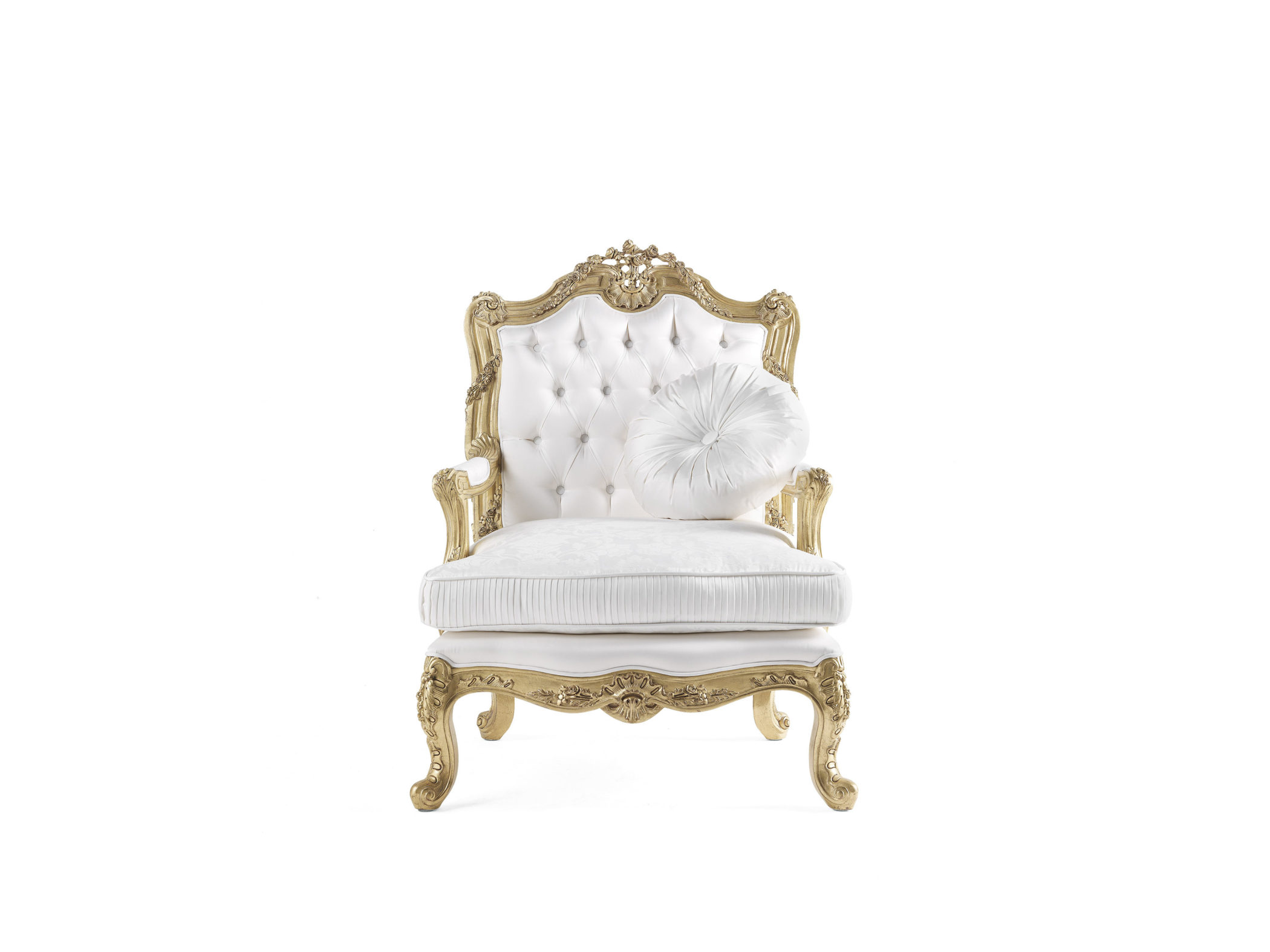 扶手椅,结构采用手工雕刻的山毛榉木制成,带有古色古香的金色饰面。泡沫填充。织物内饰。