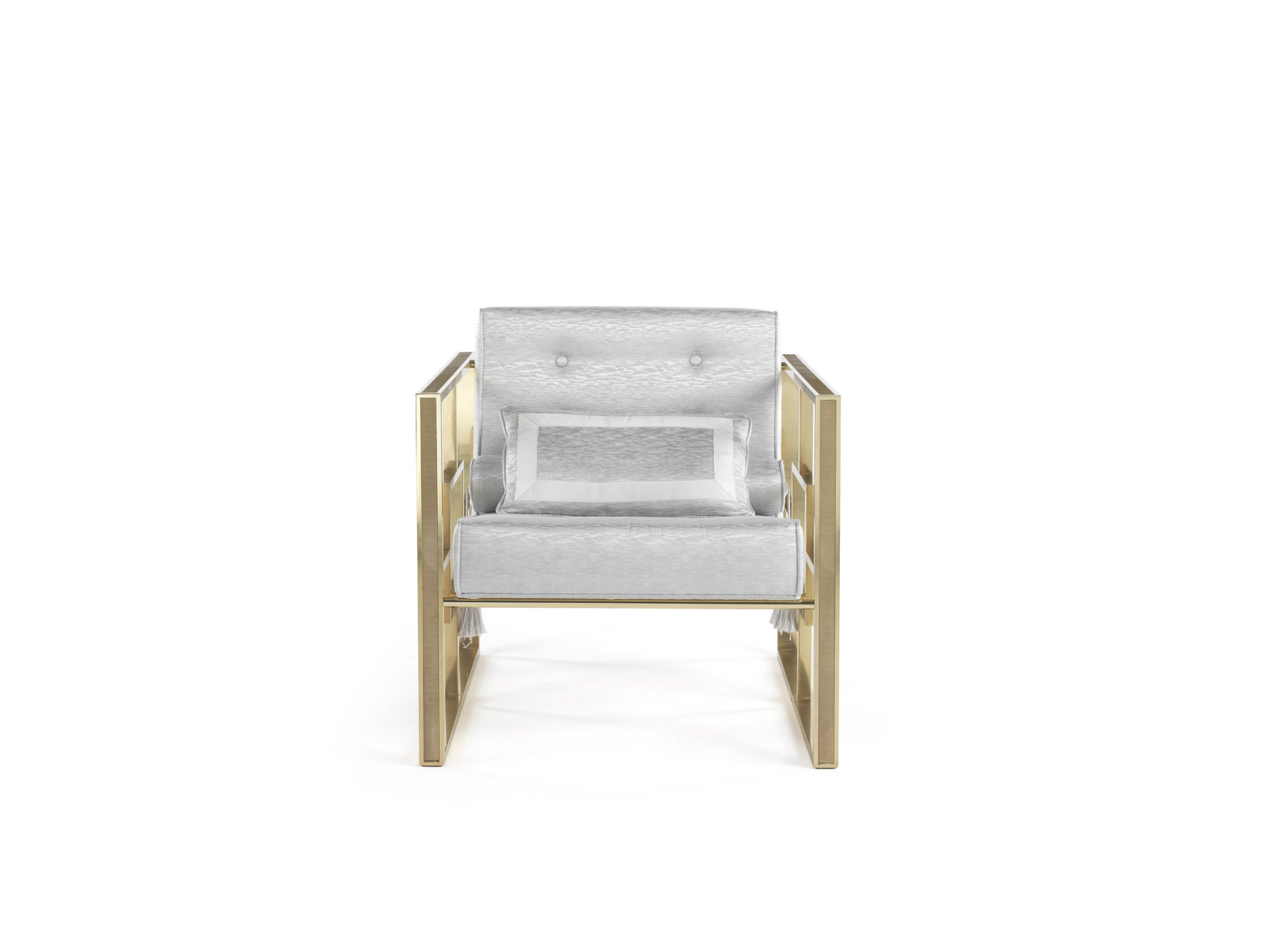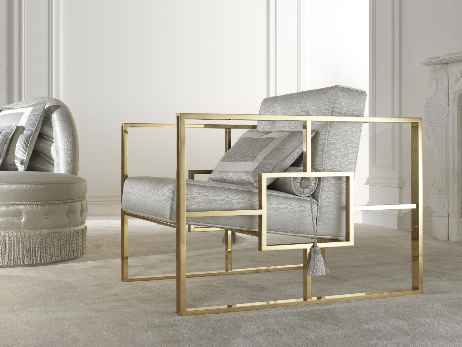黄铜结构,有光泽的表面处理和雕刻框架。座椅配有木质框架和泡沫衬垫。织物内饰。N° 1 卷,N° 1 枕头 50X30 厘米随附。