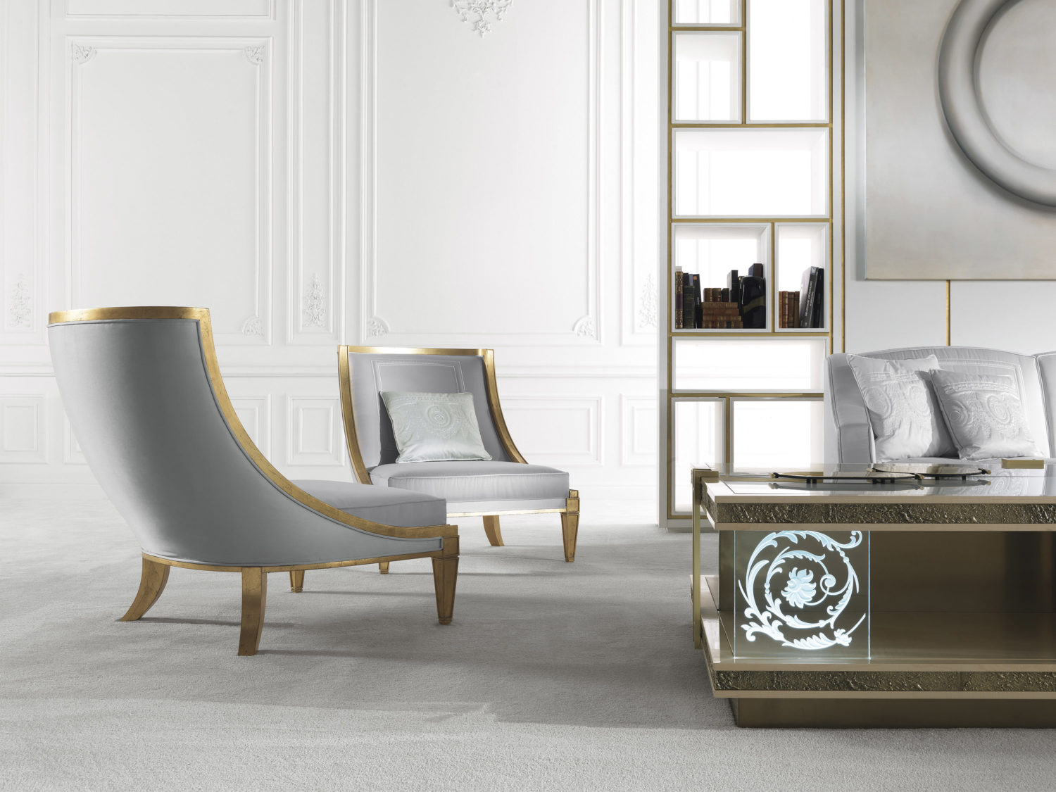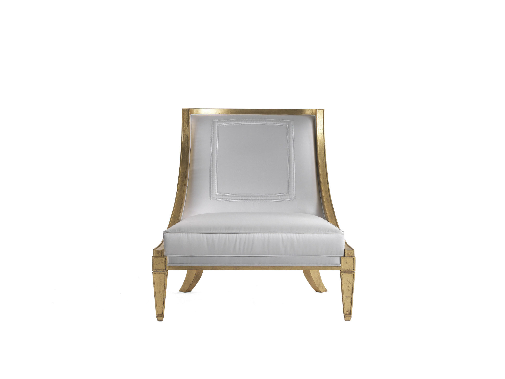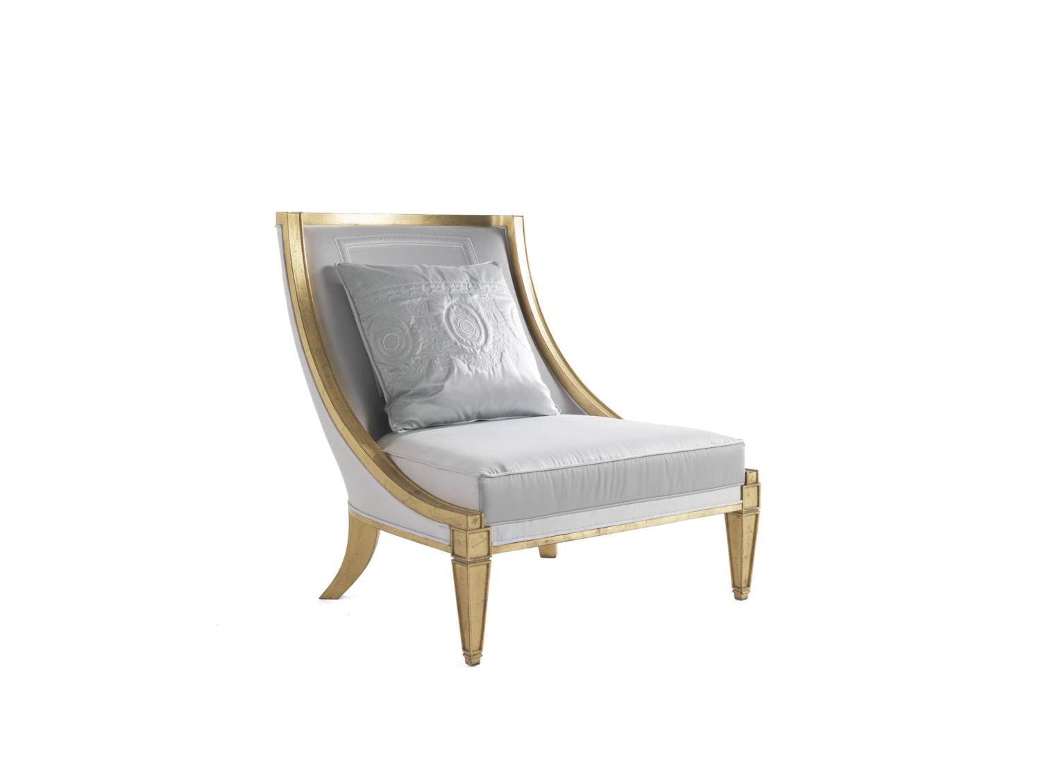 扶手椅,结构采用实心山毛榉木制成,带有古色古香的金色饰面。泡沫填充。织物内饰。