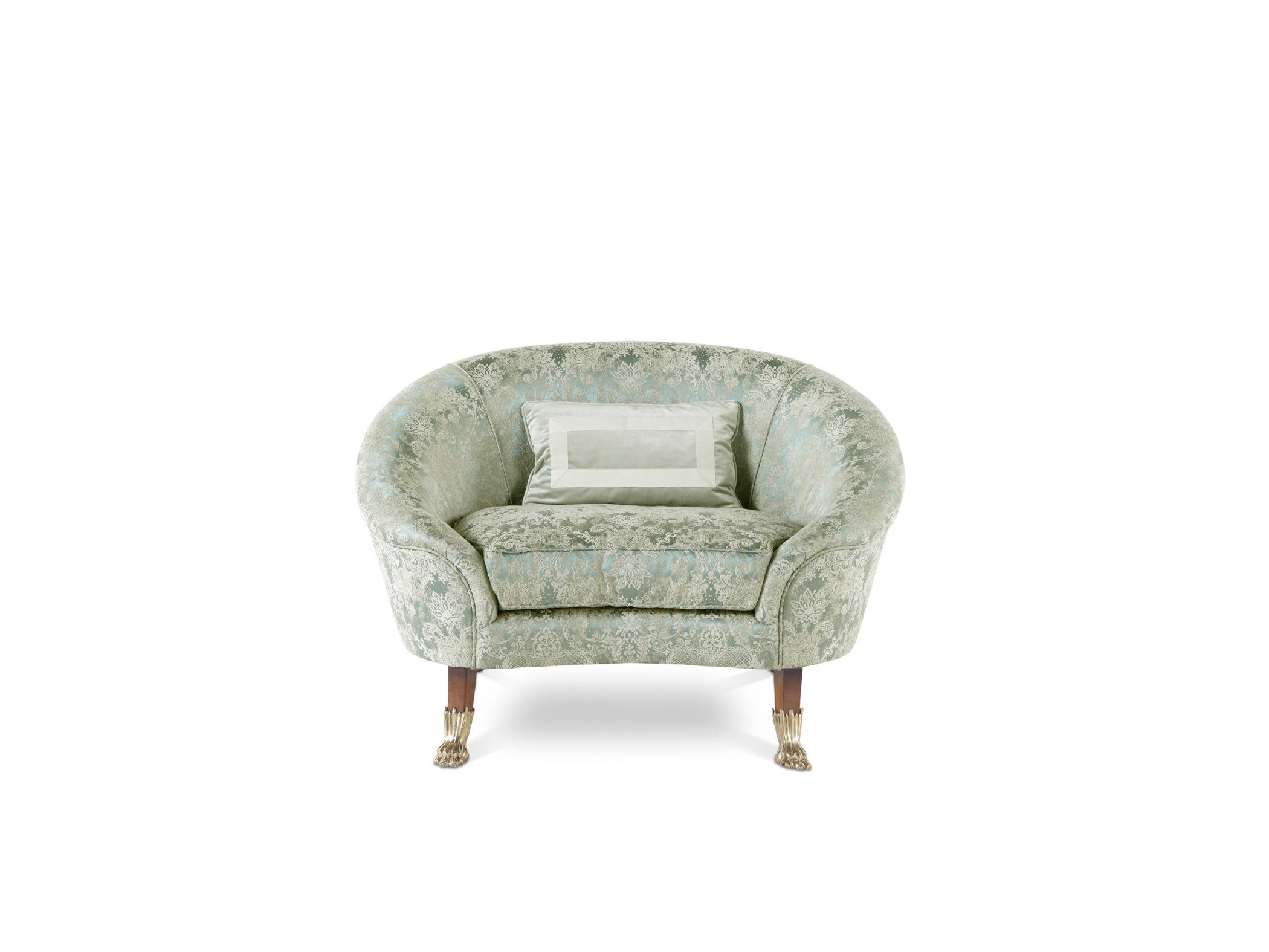 扶手椅,采用山毛榉木结构。泡沫填充。织物内饰。木腿采用光泽胡桃木制成。黄铜装饰细节。N° 1 枕头 30X50 厘米包括在内。