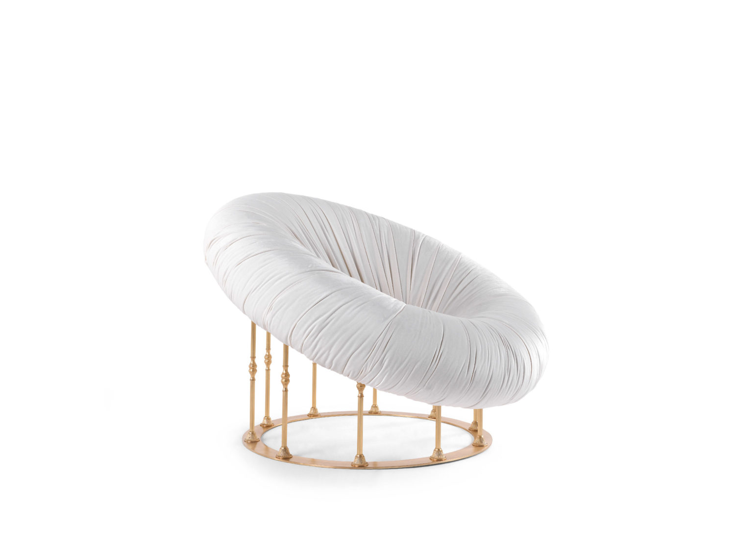 扶手椅采用多层杨木结构。泡沫填充。织物内饰。底座采用失蜡铸造黄铜。