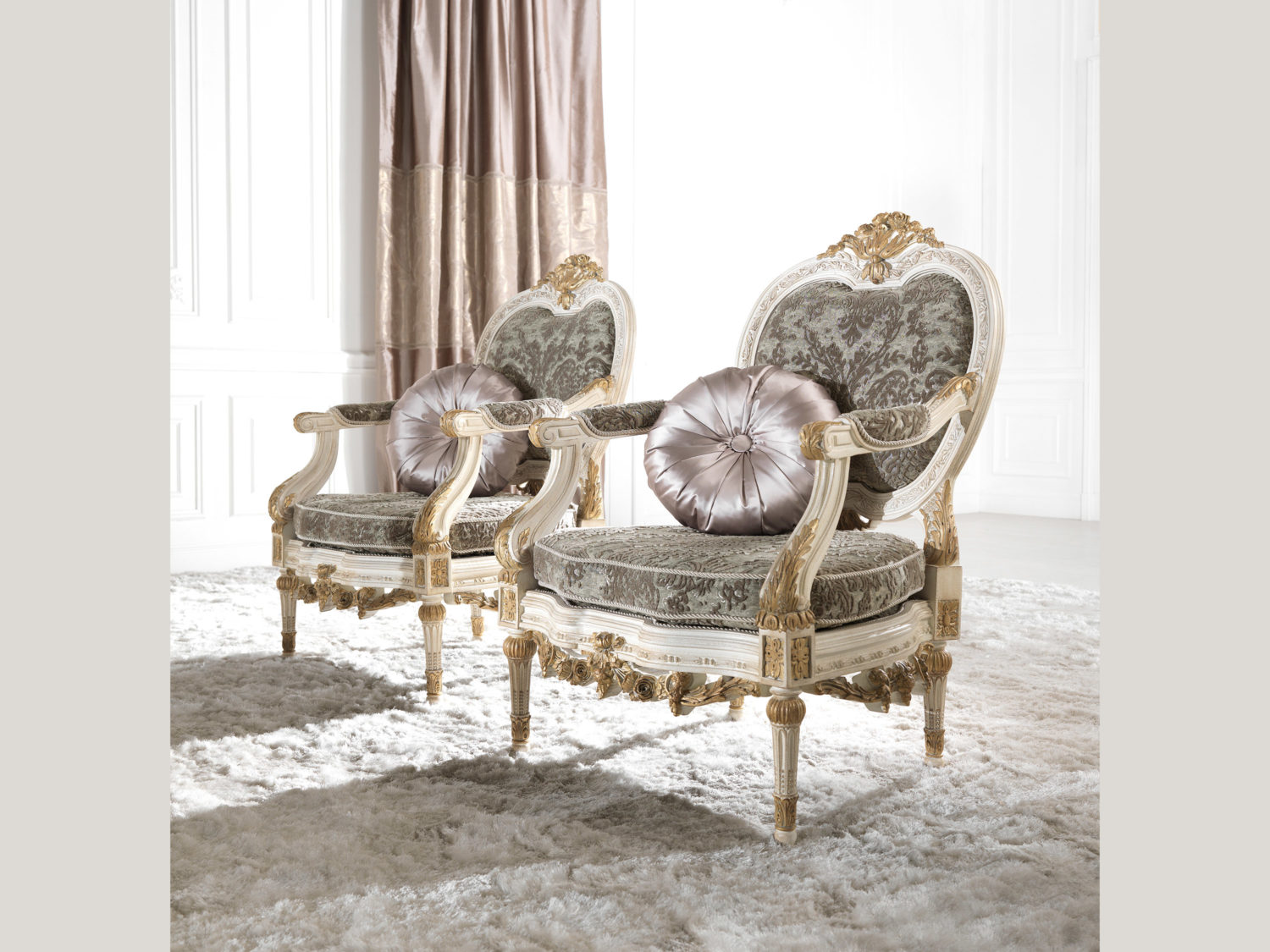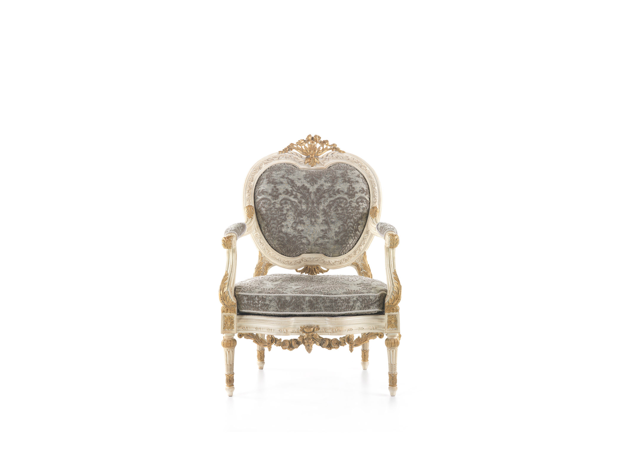扶手椅,采用手工雕刻的山毛榉木结构,带有法国金色和象牙色饰面。泡沫填充。织物内饰。N° 1 枕头 50X50 厘米, N° 1 枕头 Ø 50 厘米包括在内。