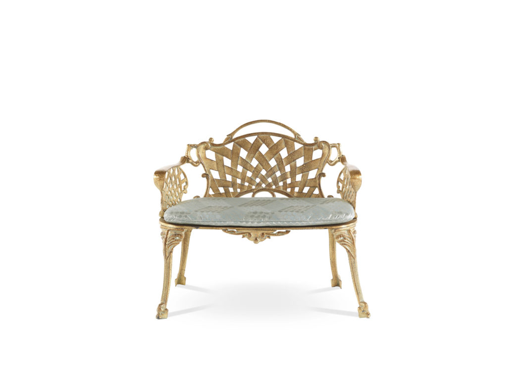 扶手椅采用铸铁结构,饰有古铜色金箔饰面。垫子与织物内饰。