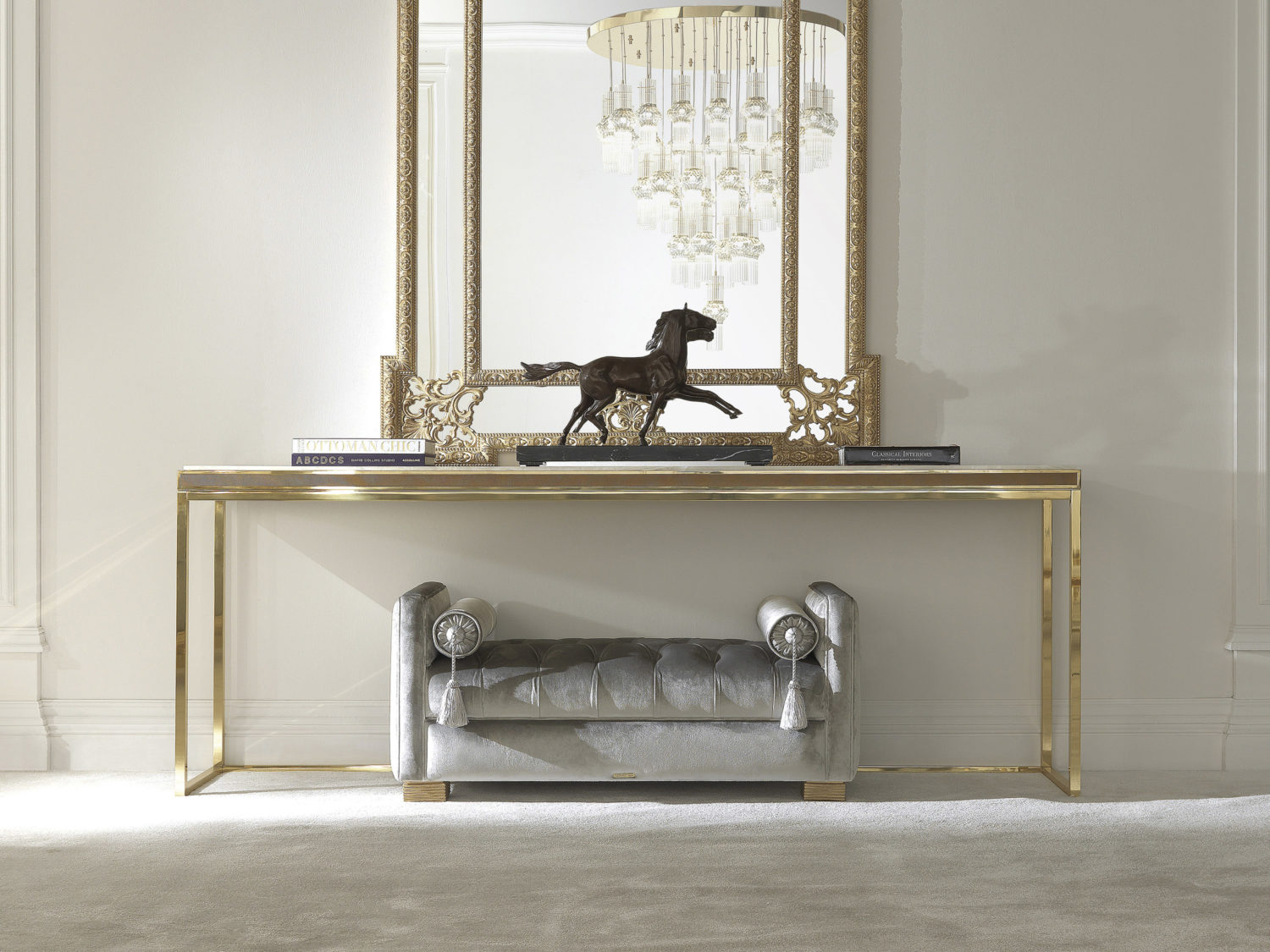 控制台采用黄铜结构,具有光泽的表面处理。雕刻框架。顶部是白色纳米比亚犀牛大理石。