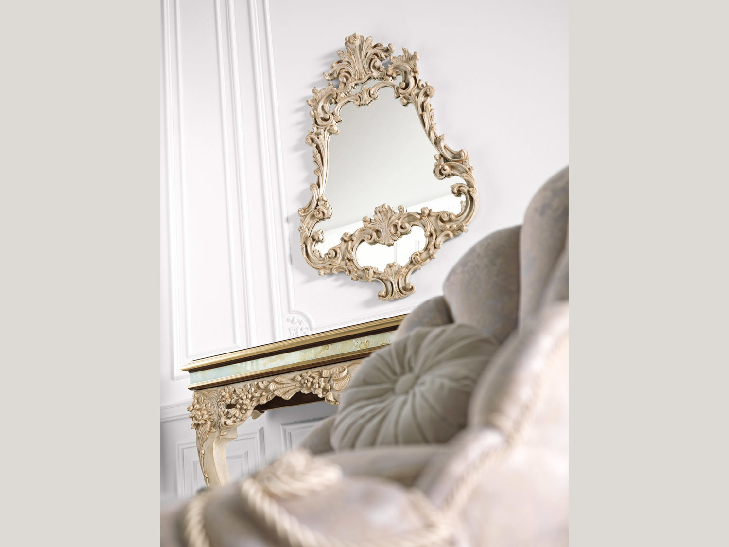 控制台采用手工雕刻的木材结构,胡桃木和古色古香的白色和金色饰面。顶部是胡桃木,上面有绿色的巴基斯坦缟玛瑙嵌件。