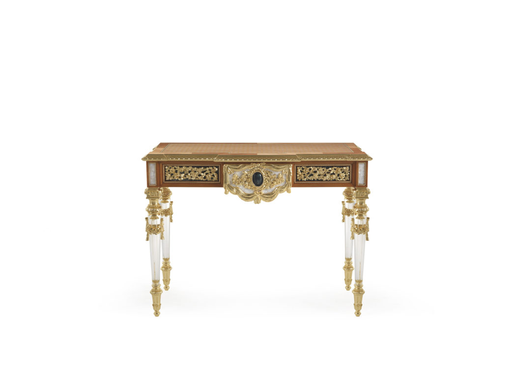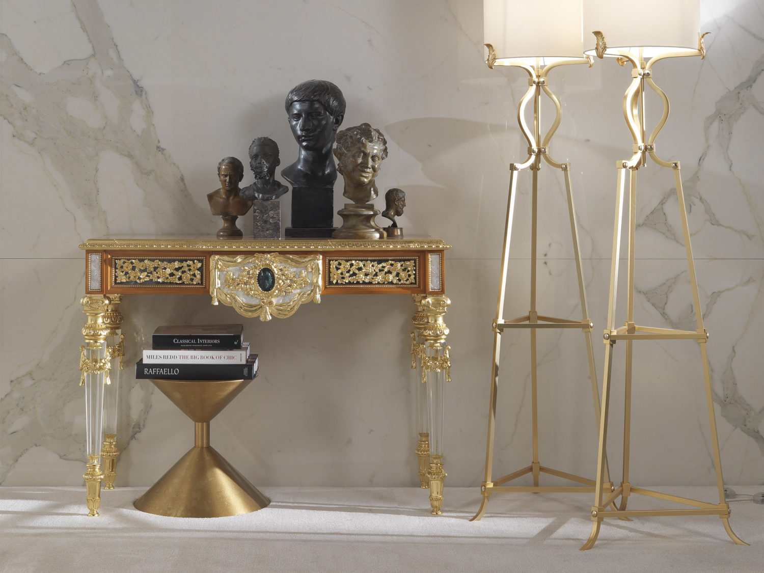 控制台采用多层木材结构,采用浅胡桃木制成。手工雕刻细节,金箔。珍珠母贝和绿色人造大理石装饰。透明树脂支腿,手工雕刻细节。顶部采用木质装饰,饰有几何镶嵌。