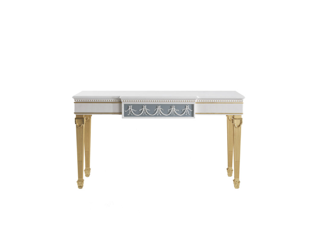 控制台采用实心山毛榉木结构。韦奇伍德陶瓷风格的装饰。白色和灰色漆面,带有饼干瓷器效果和哑光闪亮的金箔。