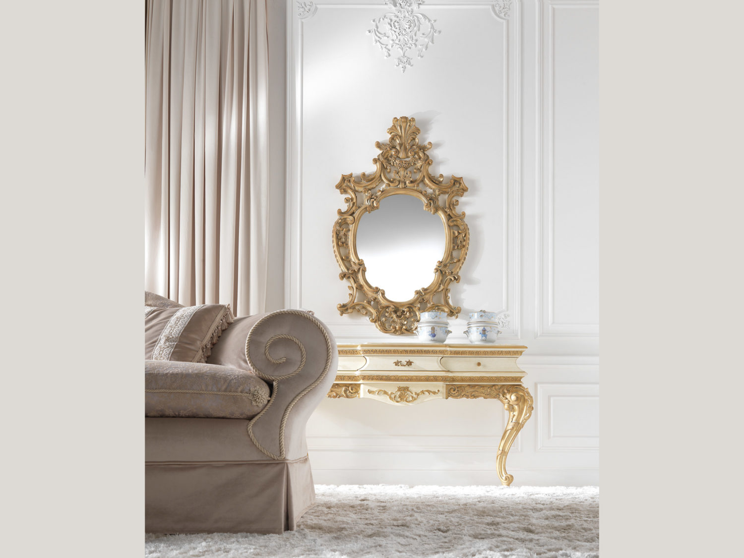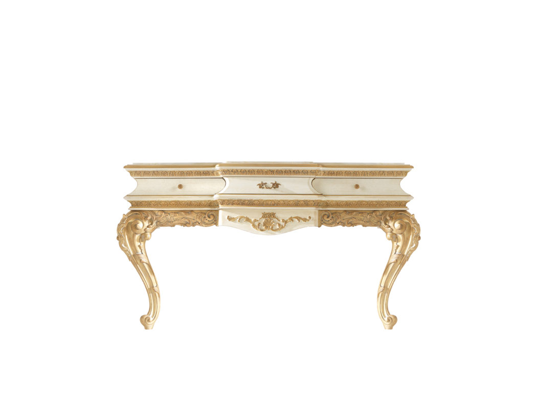 控制台采用多层漆木结构,带有法国象牙和金色饰面。手工雕刻底座。三个抽屉。顶部在绿色的巴基斯坦玛瑙。