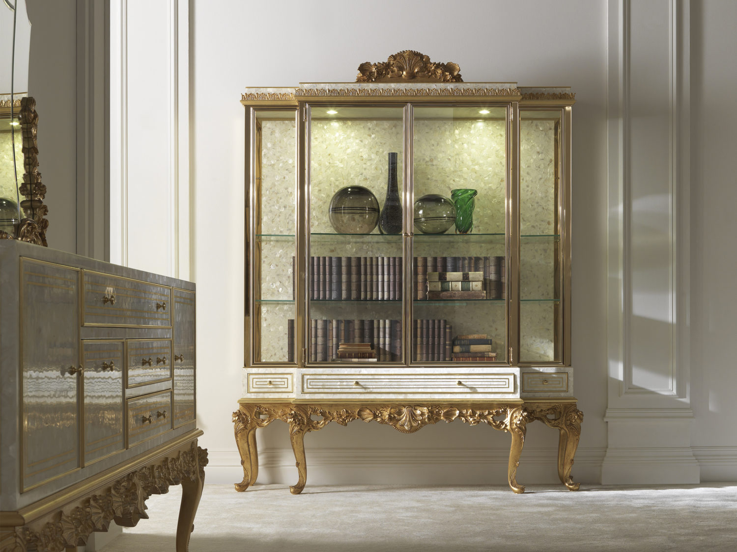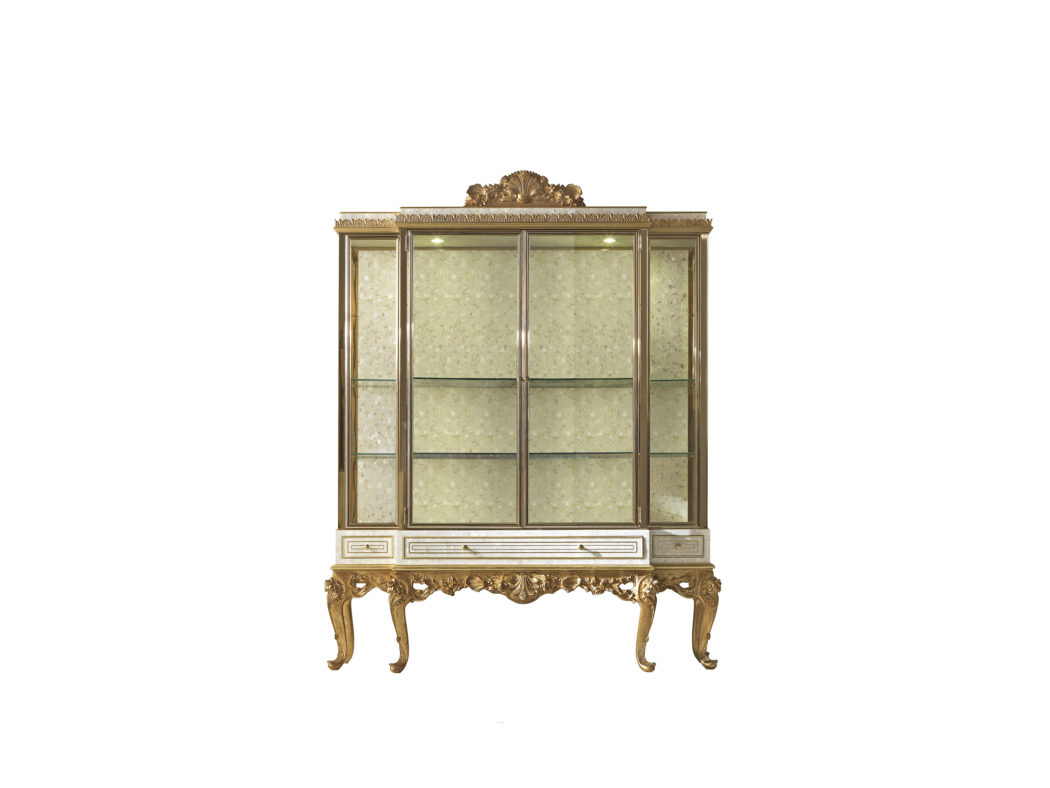 展示,结构采用多层木材和珍珠母。手工制作的金色装饰品。手工雕刻底座。玻璃门。回到珍珠母。
