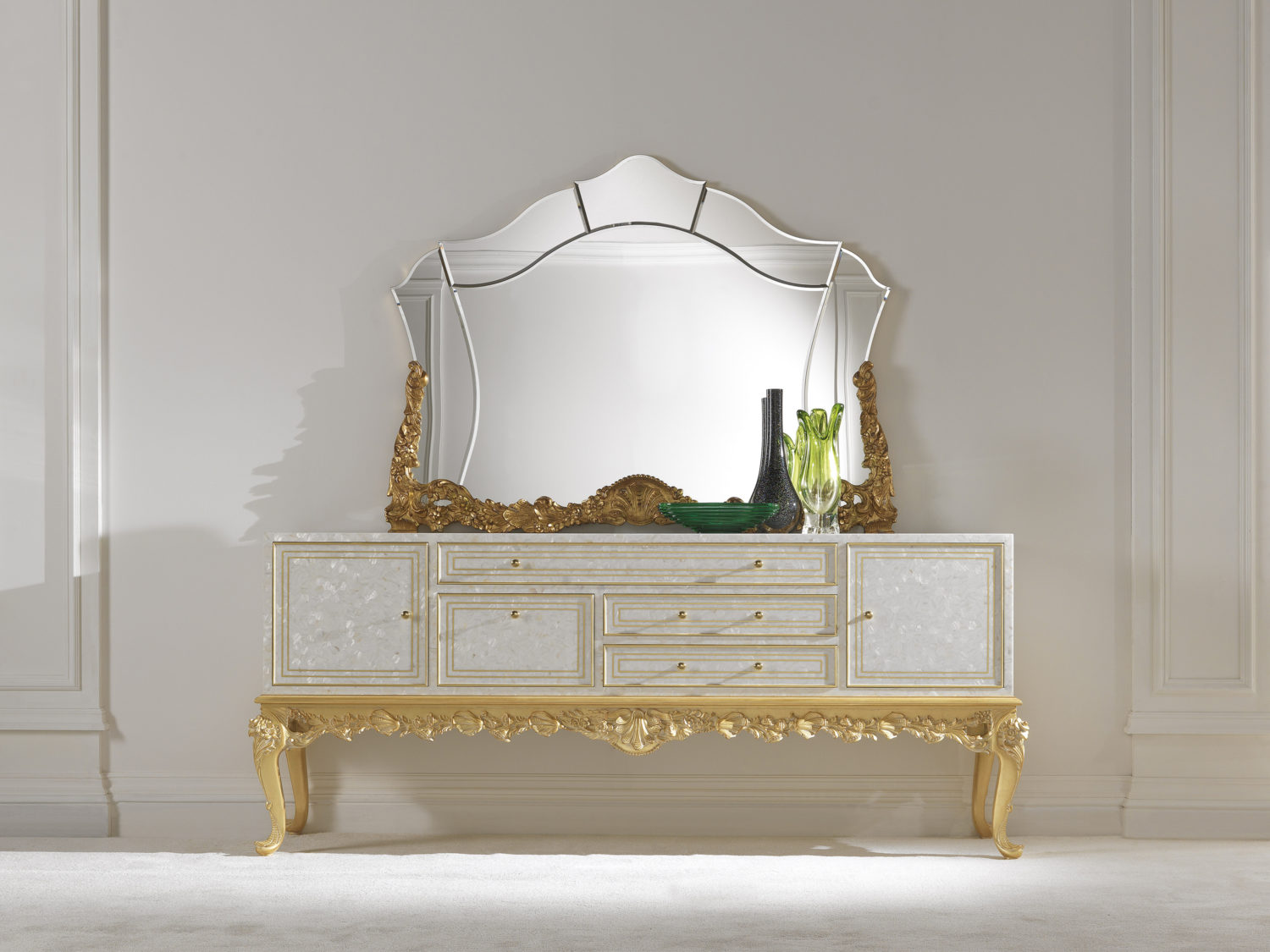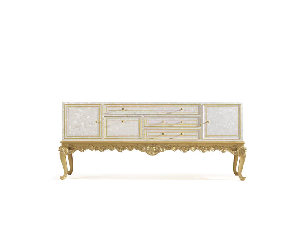 餐具柜采用多层木材和珍珠母结构。手工制作的金色装饰品。手工雕刻底座。