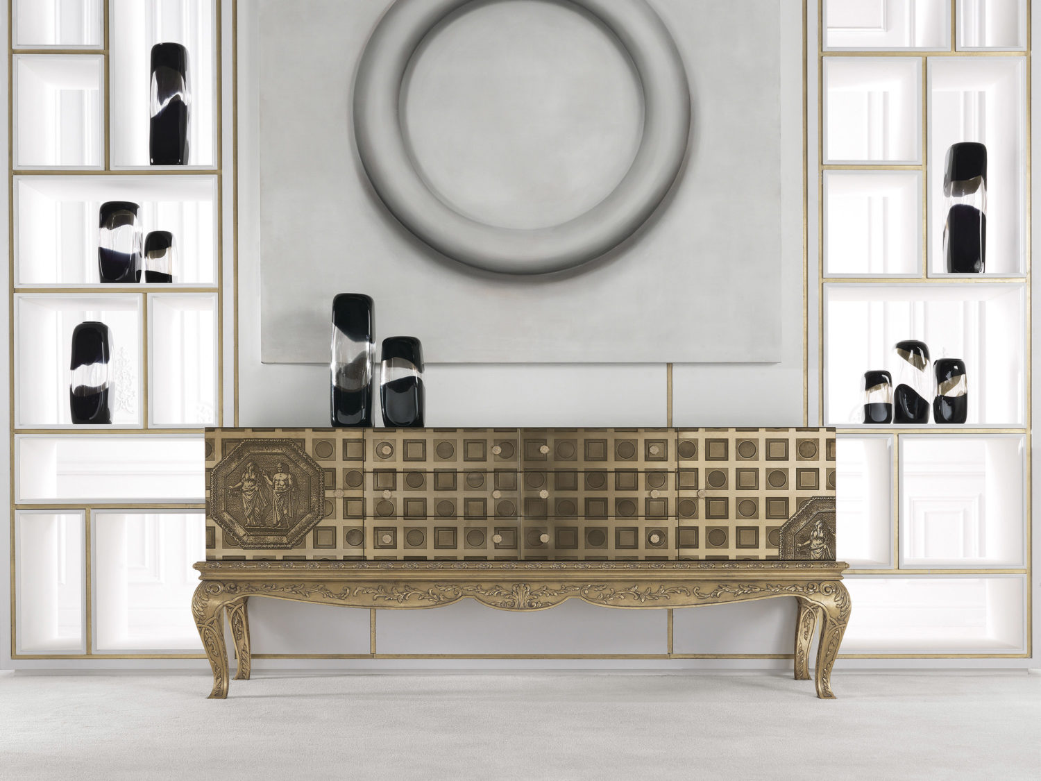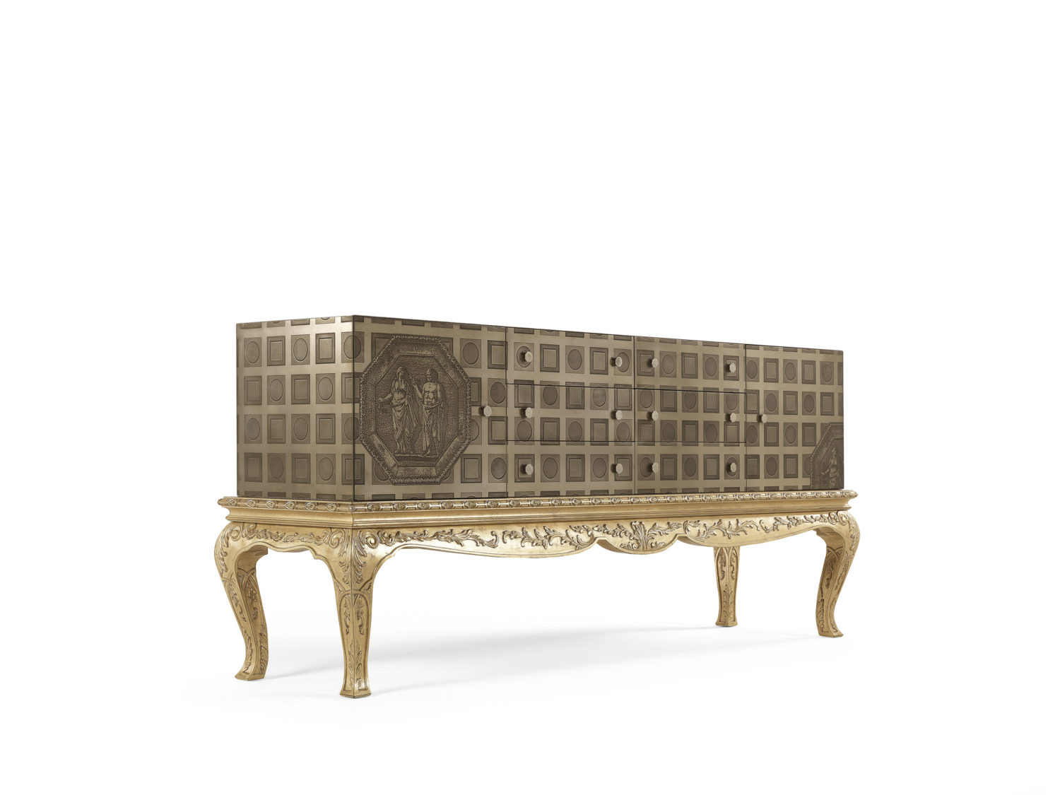 餐边柜采用实心山毛榉木结构,液态金属中带有文艺复兴时期的装饰元素。手工雕刻底座,古色古香的金色饰面。