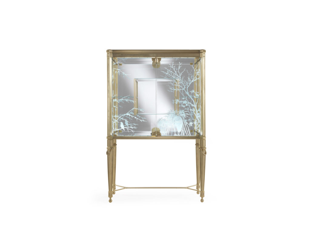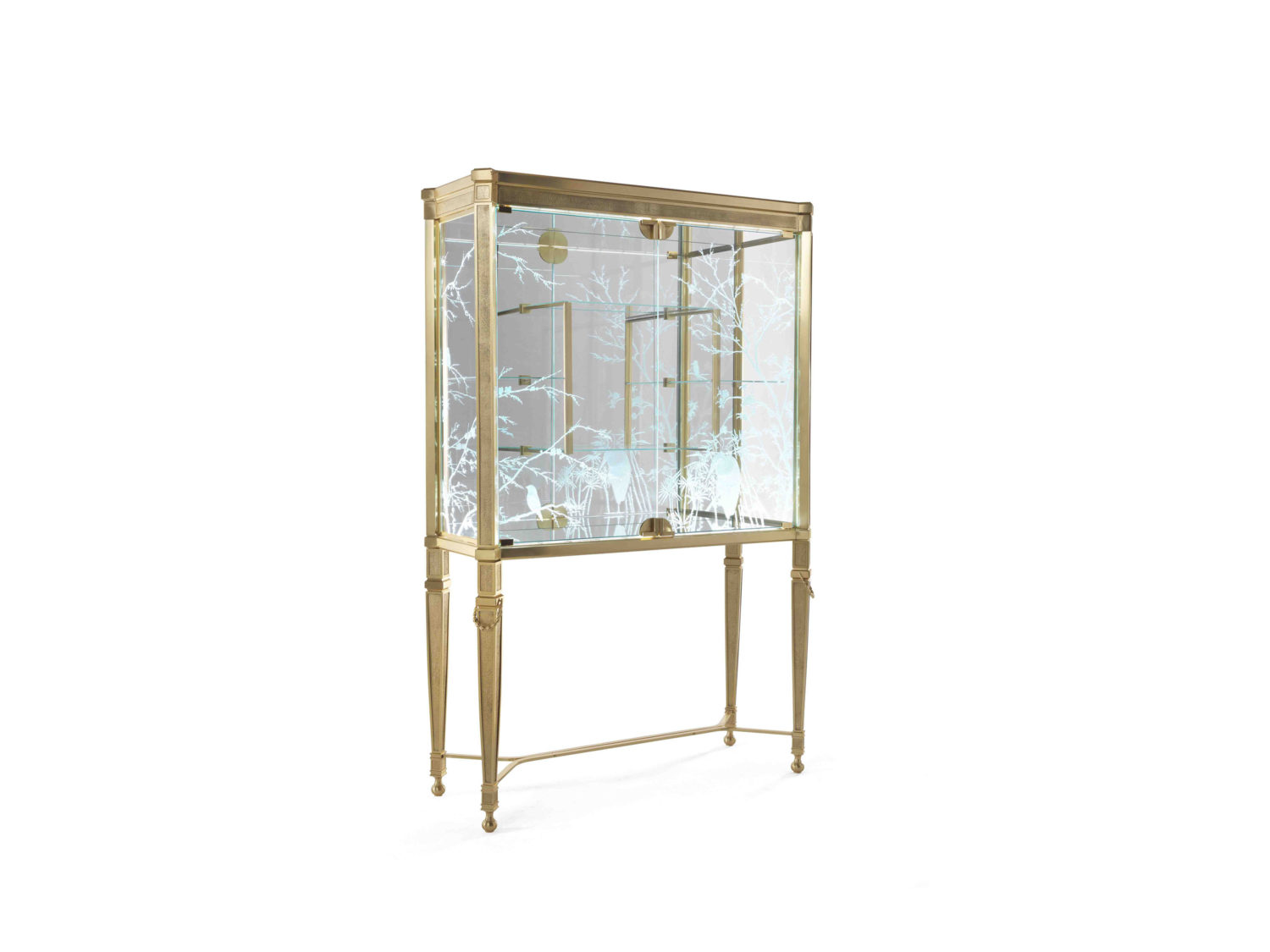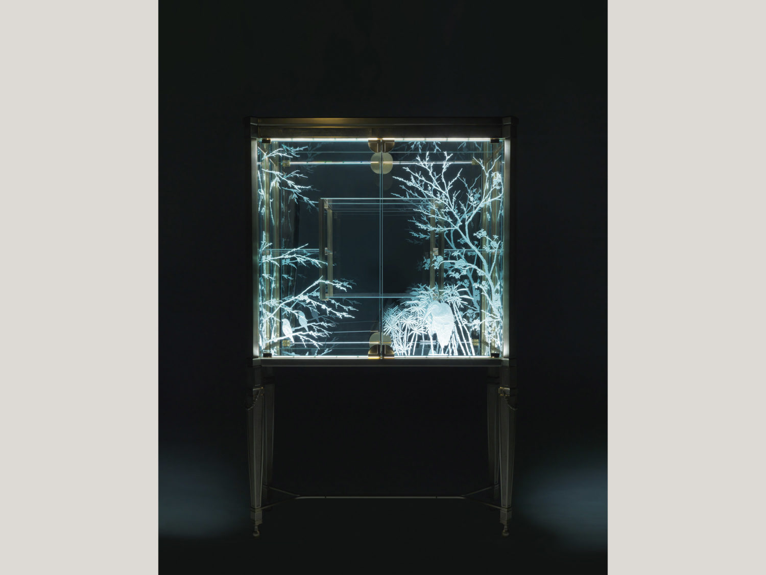 金属结构展示柜。雕刻有东方古典装饰的眼镜。照明系统。