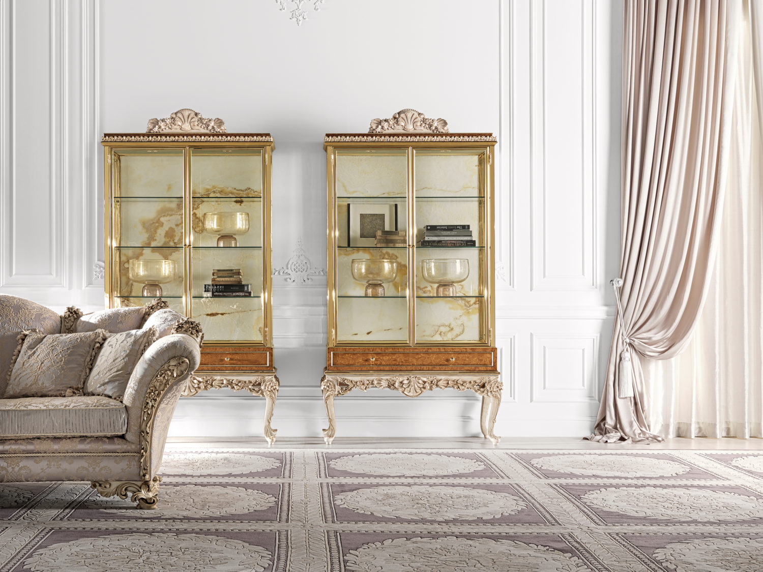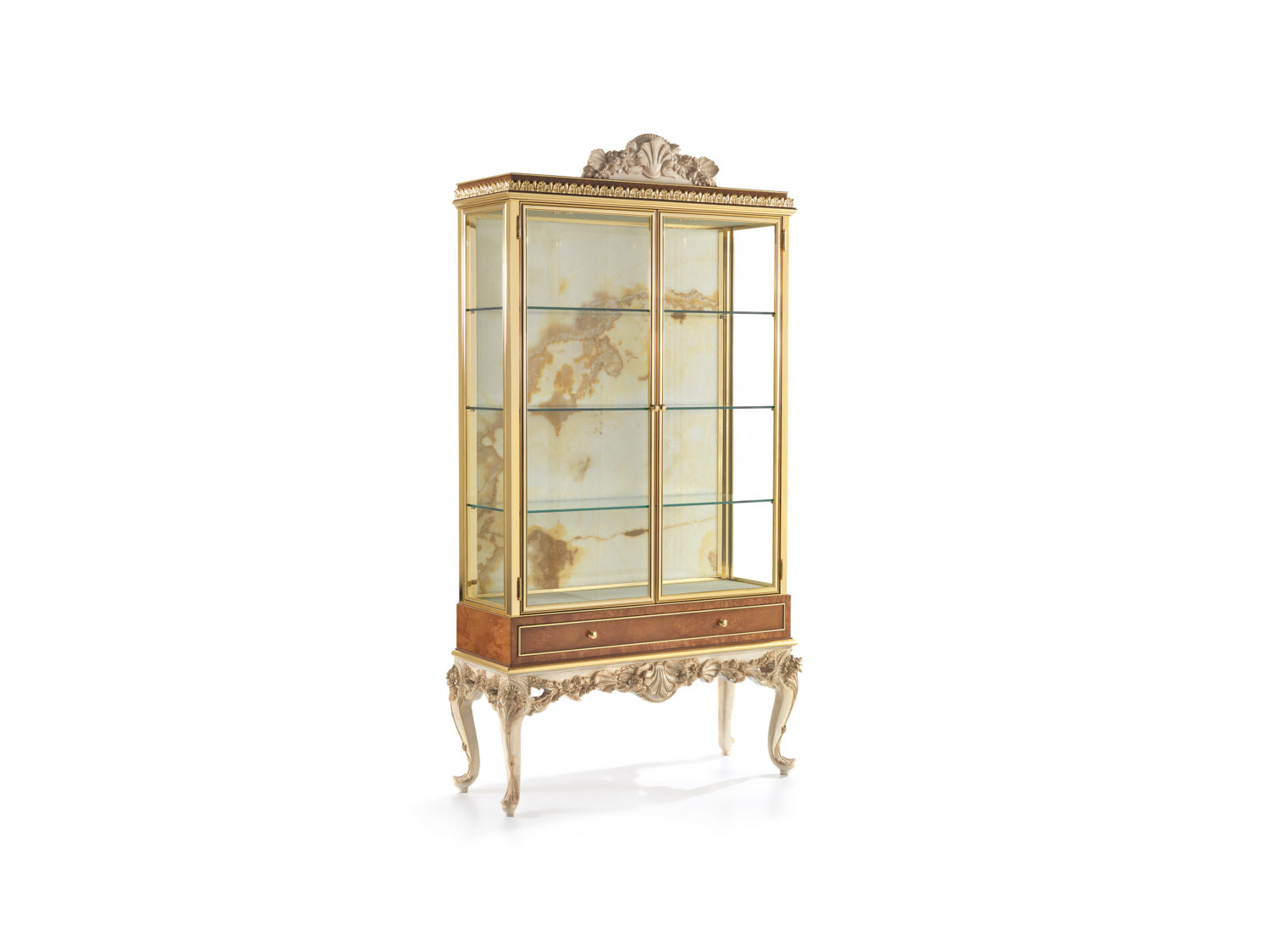 展示,底部采用手工雕刻的山毛榉木,以胡桃木和古色古香的白色和金色装饰。多层胡桃木结构。带黄铜框架的玻璃门。回到绿色的巴基斯坦玛瑙或紫罗兰玛瑙。