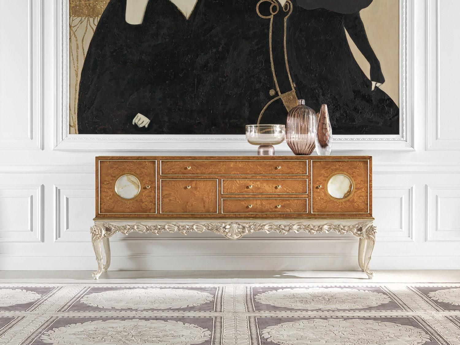 餐具柜,底部采用手工雕刻的山毛榉木制成,饰面采用胡桃木和古色古香的白色和金色。胡桃木结构,黄铜镶嵌。顶部是绿色的巴基斯坦玛瑙或紫罗兰色的玛瑙。